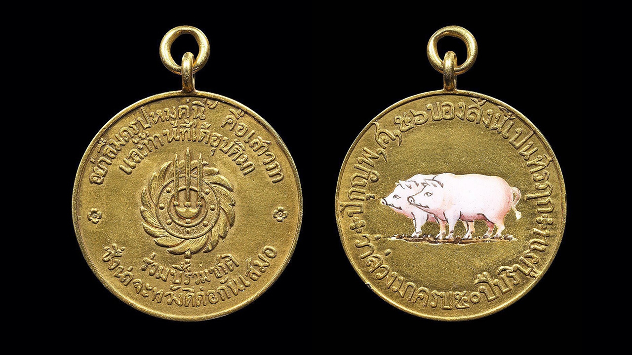 เหรียญที่ระลึก ปีกุน หมู 2 ตัว พระนางเจ้าเสาวภา พ.ศ.2456 เนื้อทองคำลงยา ของตรี บางแค.