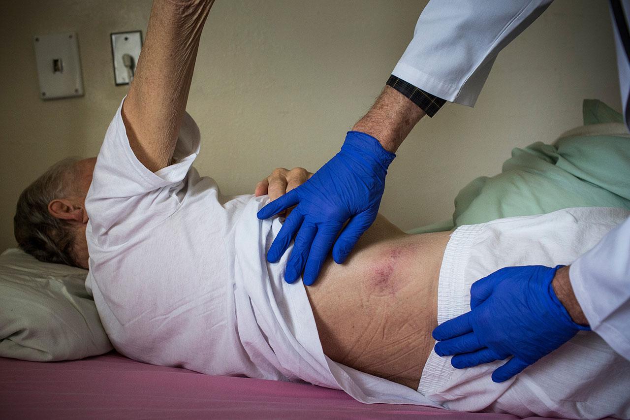 4. ในกรณีที่ผู้ป่วยช่วยเหลือตนเองได้ ควรกระตุ้นให้ผู้ป่วยขยับตัวด้วยตนเอง แต่ถ้าผู้ป่วยไม่สามารถช่วยเหลือตัวเองได้ ผู้ดูแลควรช่วยพลิกตัวอย่างน้อยต้องทุก 2 ชั่วโมง และช่วยทำกายภาพบำบัด