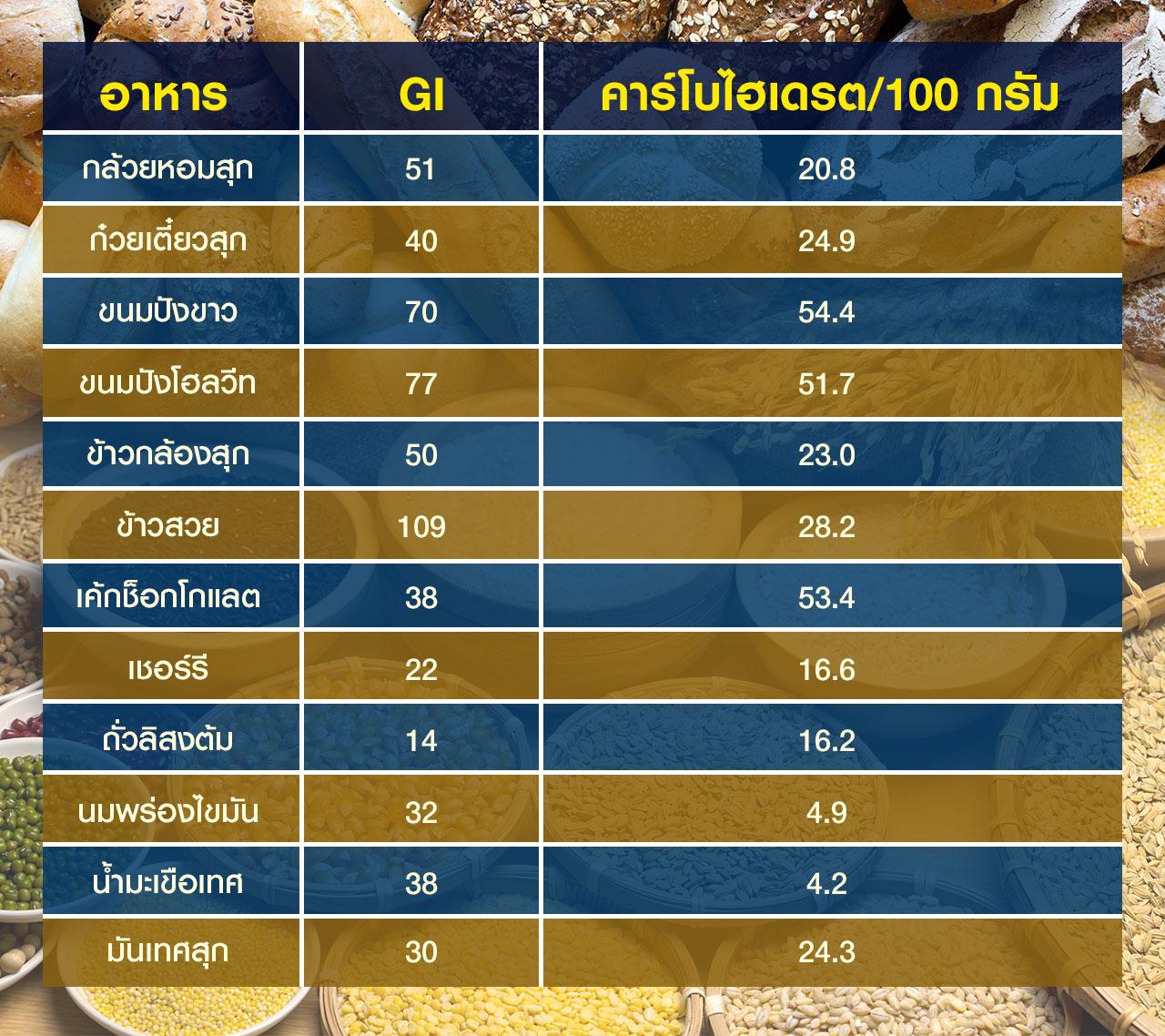 ตัวอย่างอาหารที่แสดงค่า GI โดยการเปรียบเทียบน้ำตาลกลูโคสบริสุทธิ์ให้มีค่า GI = 100 และแสดงปริมาณคาร์โบไฮเดรตต่ออาหารส่วนที่รับประทานได้ 100 กรัม