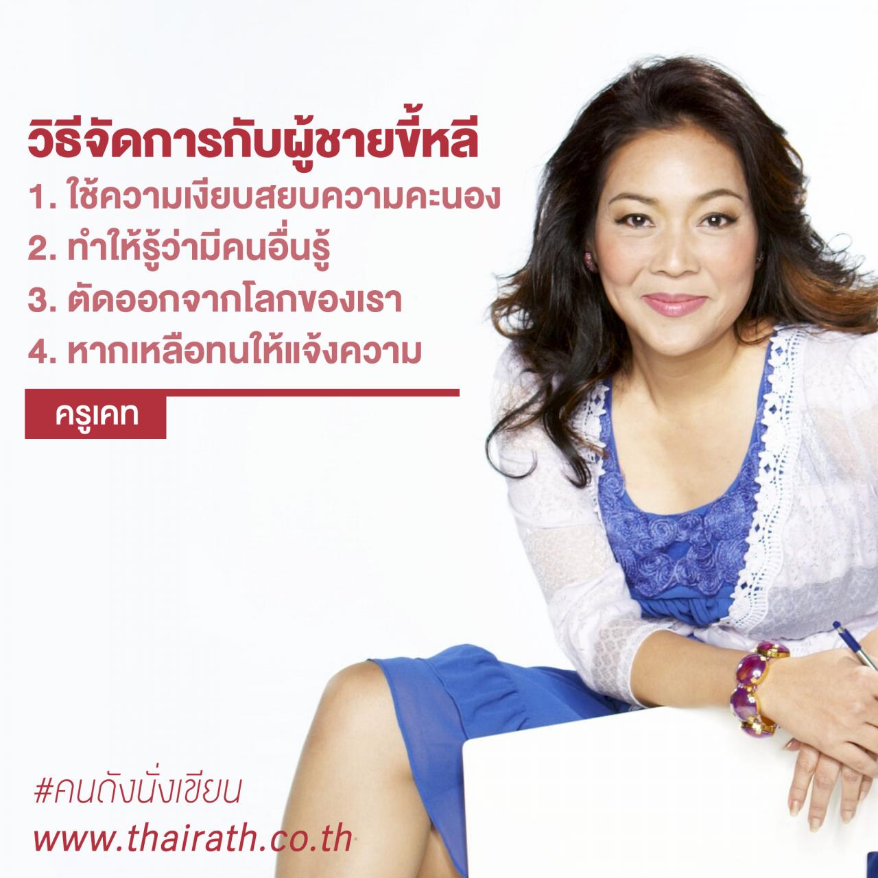 มีสุภาพสตรีผู้ติดตามคอลัมน์คนดังนั่งเขียนของไทยรัฐออนไลน์เขียนมาถามครูเคทว่า ตนเองทำธุรกิจออนไลน์แล้วมีลูกค้าชายรายหนึ่งเริ่มทักมาในไลน์เพื่อสอบถามปัญหาของสินค้าที่ซื้อไป ซึ่งในตอนแรกเธอก็ตอบให้คำแนะนำไป ต่อมาเขาเริ่ม เข้ามาสวัสดีตอนเช้าด้วยการส่งสติกเกอร์ เธอก็ไม่ได้คิดอะไร เพราะพวกว่างจัดเหงาจัดก็มักจะส่งสติกเกอร์รูปดอกไม้รูปวิวอะไรมาทุกเช้าอยู่แล้ว ต่อมาก็เริ่มเข้ามาทักหรือมาคอมเมนต์รูปโปรไฟล์ว่าน่ารักจังอะไรทำนองนี้ หรือส่งคำคมอะไรมาทำนองให้กำลังใจกัน จากนั้นก็เริ่มขอเป็นแฟนจะได้หรือไม่ ฯลฯ เธอจึงถามว่าจะทำอย่างไรดี จะด่าไปก็กลัวจะเสียลูกค้าเสียธุรกิจ เพราะเขาก็ยังสั่งของอยู่เรื่อยๆ แต่ตัวเธอนั้น ไม่ต้องการความสัมพันธ์ในลักษณะนี้