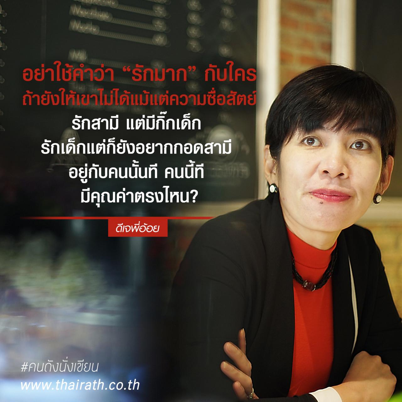 ชีวิตต้องเลือกค่ะ อย่ารวบ เราไม่ใช่ศูนย์กลางจักรวาลที่อยากให้ดาวบริวารทุกดวงต้องโคจรรอบตัวเรา สามีต้องอยู่ ชู้ก็ยังมี แล้วต้องดีต่อกัน ไม่สร้างความเดือดร้อนให้กันและกัน จะเห็นแก่ตัวอะไรเบอร์นั้น อย่าใช้คำว่า “รักมาก” กับใคร ถ้ายังให้เขาไม่ได้แม้แต่ความซื่อสัตย์ รักสามี แต่มีกิ๊กเด็ก รักเด็กแต่ก็ยังอยากกอดสามี อยู่กับคนนั้นที คนนี้ที มีคุณค่าตรงไหน