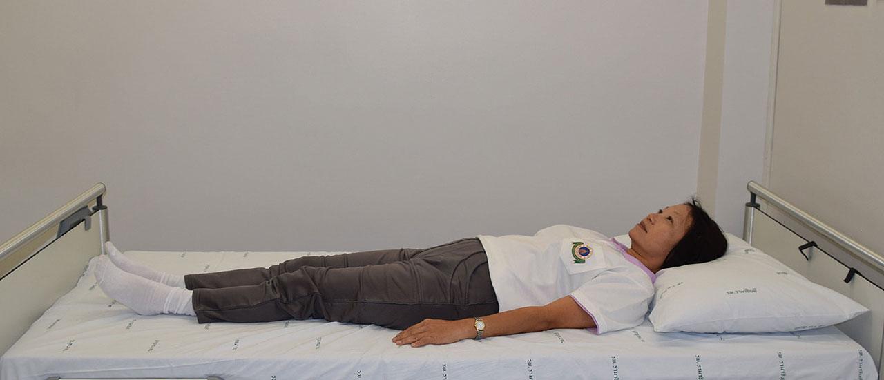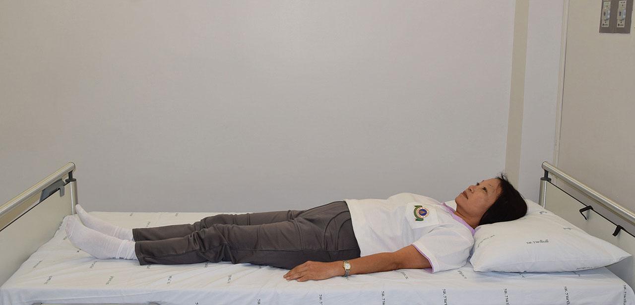 1. นอนราบบนที่นอน แขนทั้งสองวางข้างลำตัว