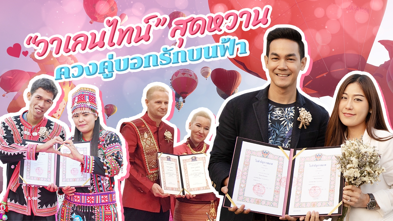 แน่นอนว่า "วาเลนไทน์" ทั้งทีแบบนี้ ไลฟ์สไตล์ไทยรัฐ ไม่พลาดที่จะเก็บบรรยากาศของเหล่าบรรดาคู่รักทั้ง 20 คู่ที่ร่วมจดทะเบียนสมรสหมู่ จนเชียงรายหวานเจี๊ยบมาฝากเพื่อนๆ อย่างแน่นอน และที่น่าอิจฉาไปกว่าคือการขึ้นบอลลูนไปกระซิบบอกเลิฟคนรักกันอย่างเอ็กซ์คลูซีฟบนฟ้า โอ๊ย...งานนี้บอกเลยว่า คนโสดมีแต่จะตาร้อน !!