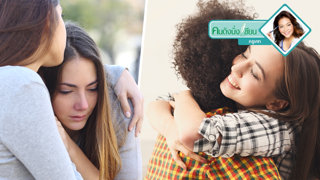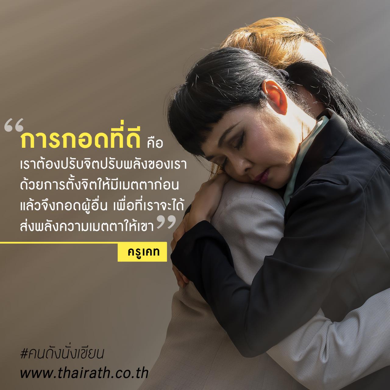 การกอดมีแต่สิ่งดีๆ อย่างนี้ เราควรจะเริ่มกอดกันให้บ่อยขึ้นนะคะ แต่ครูเคทว่าเราเริ่มกอดคนสำคัญในครอบครัวเราอย่างพ่อแม่พี่น้องลูกคู่สมรสของเราก่อนดีกว่า ไม่ใช่มัวแต่ไปกอดคนแปลกหน้าในการอบรมสร้างแรงบันดาลใจหรือในกิจกรรมทางสังคม เพราะเราไม่รู้ว่าคนแปลกหน้าเหล่านั้น มีสภาวะจิตใจ หรือ vibration หรือคลื่นความสั่นสะเทือนแบบใด หากจิตไม่ดี ไม่นิ่ง (เช่น โลภ เศร้า โกรธ) แล้วเราไปกอดเขาก็อาจจะมีการแลกเปลี่ยนพลังงานความสั่นสะเทือนกันได้ และการกอดที่ดีนั้น เราต้องปรับจิตปรับพลังของเราด้วยการตั้งจิตให้มีเมตตาก่อน แล้วจึงกอดผู้อื่นเพื่อที่เราจะได้ส่งพลังความเมตตาให้เขา ไม่ใช่ส่งพลังลบให้เขาค่ะ ส่วนใครรู้สึกเคอะเขินที่จะกอด ก็ให้เริ่มใช้การสัมผัสเบาๆ ก่อนก็ได้ เช่น จูงมือ โอบไหล่ เมื่อคุ้นเคยไม่เขินแล้วก็ค่อยกอดกันอย่างอ่อนโยนและเมตตาค่ะ