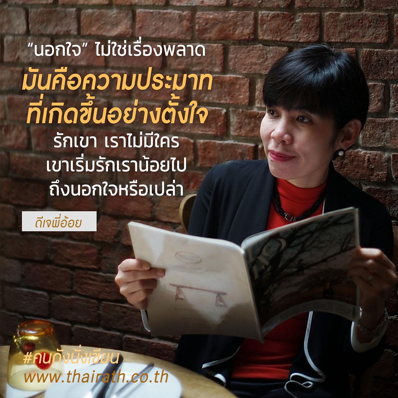 คนเรามีวันหมดอายุด้วยกันทุกคนค่ะ จะรีบหยุดลมหายใจไปก่อนทำไม การฆ่าตัวตายเพื่อให้คนหลายใจสมหวัง มันคุ้มกันตรงไหน อยู่ขวางความเจริญกันไว้ก็ยังดีค่ะ อย่าฆ่าตัวตายเพื่อคนที่ไม่ได้รัก แล้วมาทำร้ายหัวใจคนที่รักเราเท่าชีวิต ลองค่อยๆ ใช้สติ คุยกับตัวเองดีๆ ก่อนที่จะไปคุยหรือเคลียร์กับใครๆ “นอกใจ” ไม่ใช่เรื่องพลาด มันคือความประมาทที่เกิดขึ้นอย่างตั้งใจ รักเขา เราไม่มีใคร เขาเริ่มรักเราน้อยไป ถึงนอกใจหรือเปล่า และถ้าเป็นแบบนั้น ต่อให้เราป้องกันแค่ไหน คนที่ใจไม่ได้อยู่กับเรา ต่อให้กีดกันผู้ชายคนเก่า เดี๋ยวเขาก็ต้องมีผู้ชายคนใหม่อยู่ดี ความจริงอยู่ตรงหน้า เราต้องกล้ายอมรับความจริง หากผู้หญิงของเราหมดใจ คงต้องปล่อยให้เขาไป เพราะต่อให้ไม่ปล่อย ก็ใช่ว่าเขาจะไม่ไป ตอนนี้มันไม่ใช่แค่เรื่องนอกกาย แต่คือนอกใจ เพราะเขาเอาหัวใจไปให้คนคนนั้นแล้ว ถึงต้องขอเวลา ในการตัดใจ... เราเจ็บปวดไปไหม ที่ต้องยอมรับให้ไหวว่าคนใกล้ๆ กำลังอกหัก เพราะรักคนนั้นแต่อยู่ด้วยกันไม่ได้ ทำใจ ก่อนเปิดใจคุยกันอีกครั้งว่า เรายังรักกันมากพอจะเดินหน้าต่อไหม ถ้า “ไม่” คงต้องต่างคนต่างไป อย่าอยู่ใกล้ๆ แต่ไม่ให้คุณค่ากันแบบนี้ ความซื่อสัตย์เป็นคุณสมบัติง่ายที่สุดของคนรักกัน อย่าบอกใครว่ารักมาก ถ้ายังไม่อยากมีใครแต่เพียงผู้เดียว กอดคนหนึ่ง คิดถึงอีกคนหนึ่ง คนที่อยู่ในอ้อมกอดอ้างว้างไปค่ะ ถ้ารู้ว่าอยู่กับเราแค่ตัว แต่เอาหัวใจให้คนอื่นไปแล้ว อย่ายื้อคนหมดใจไว้ใกล้ตัว หัวใจเราจะเจ็บที่สุด หรือถ้าเธอบอกว่า ยังอยากมีเราอยู่ตรงนี้ ก็ต้องลองเสี่ยงกันอีกที ว่าความไว้ใจที่ยังพอมี เธอเอาไปใช้ทำอะไร อย่าให้โอกาสแต่เขา จนปิดโอกาสตัวเราที่จะมีความสุขแล้วกัน