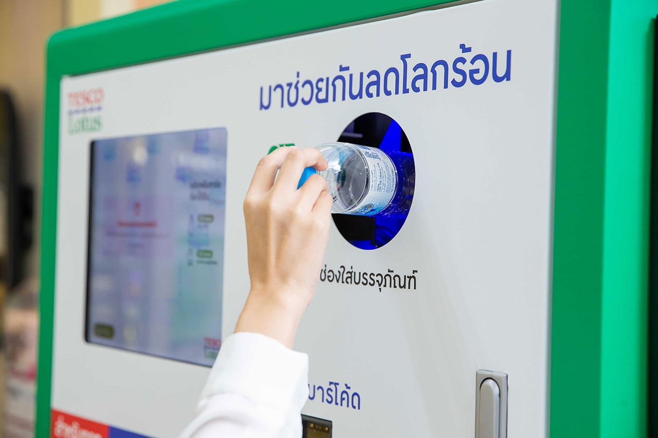 - เครื่องรีไซเคิลขวดพลาสติกและกระป๋อง ให้ลูกค้าสามารถนำบรรจุภัณฑ์ที่ไม่ใช้แล้วมาคืนเพื่อนำไปเข้ากระบวนการรีไซเคิลต่อไป โดยเทสโก้ โลตัส มีแผนงานติดตั้งเครื่องรีไซเคิลเพิ่มเติมในอนาคต จากปัจจุบันจำนวน 10 เครื่อง โดยลูกค้าที่นำขวดพลาสติกและกระป๋องมาหยอดจะได้รับแต้มคลับการ์ด 25 แต้ม ทั้งนี้ เทสโก้ โลตัส ได้ร่วมมือกับเอสซีจี ในการนำขวดพลาสติกมารีไซเคิลเป็นถุงผ้า ตามเป้าหมายในการสร้างระบบปิดของบรรจุภัณฑ์