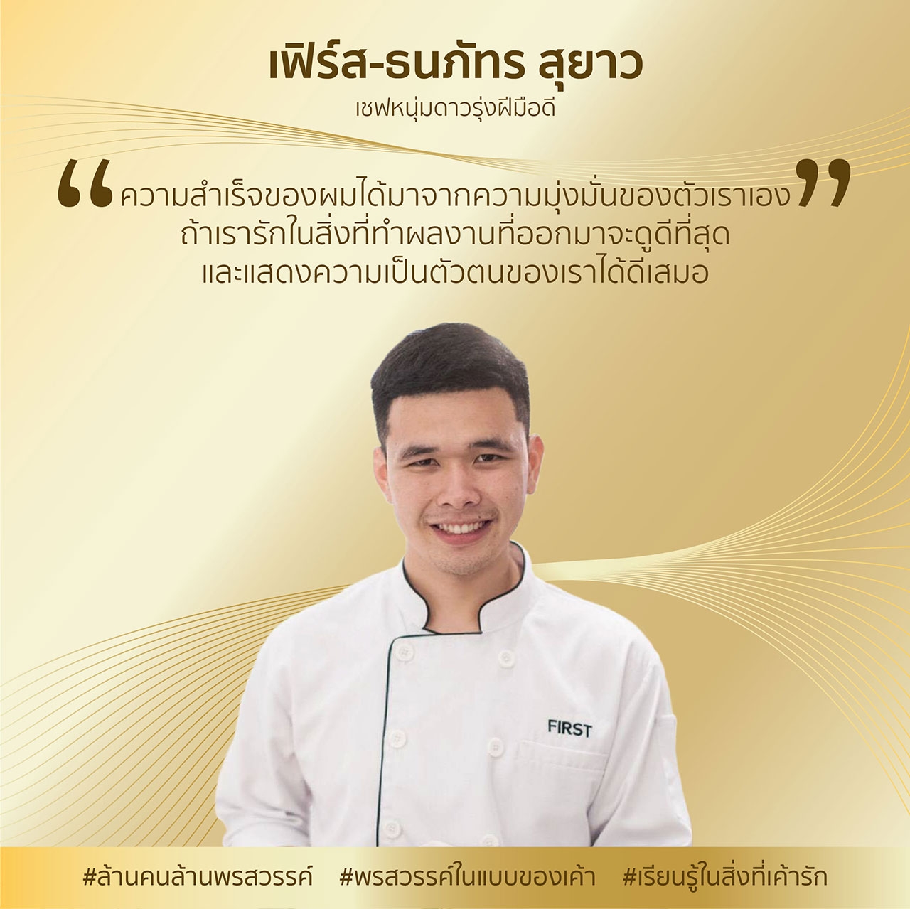 น้องเฟิร์ส เชฟหนุ่มจากเมืองน่าน ผู้ชนะที่อายุน้อยที่สุดจากรายการ MasterChef Thailand ซีซั่น 2 เล่าว่า เฟิร์สช่วยคุณแม่ทำอาหารตั้งแต่เด็ก และคิดว่าการทำอาหารสามารถประกอบอาชีพเลี้ยงตนเองและครอบครัวได้ จนผมเริ่มชอบการทำอาหารจริงๆ จังๆ ตอนช่วงมัธยมปลาย ซึ่งเป็นช่วงที่ต้องทำอาหารทานเองอยู่บ่อยๆ เวลาดูรายการทำอาหาร ผมจะรู้สึกสนุกและสนใจเป็นพิเศษ จนทำให้เราอยากที่จะเรียนรู้ในการทำอาหารให้ดียิ่งขึ้น แต่ด้วยความที่ผมโตมากับการเป็นนักกีฬา ในช่วงแรกที่เราบอกครอบครัวว่าอยากจะเปลี่ยนเป็นเชฟเป็นเรื่องที่ท้าทายมาก แต่โชคดีที่ครอบครัวผมเข้าใจ และเป็นกำลังใจสนับสนุนให้เราทำในสิ่งที่รัก ผมเลยได้โอกาสได้เดินทางสายนี้ “สำหรับผมการเรียนรู้เป็นฟันเฟืองสำคัญในการพัฒนาตัวเอง ตั้งแต่การพัฒนาความคิด ไปจนถึงความสามารถในการทำ ผมเชื่อว่าถ้ายิ่งเราได้เรียนรู้ และลงมือทำให้สิ่งที่รัก ผลงานที่ได้จะออกมาดูดี และแสดงความเป็นตัวตนของเราได้ดีที่สุด”