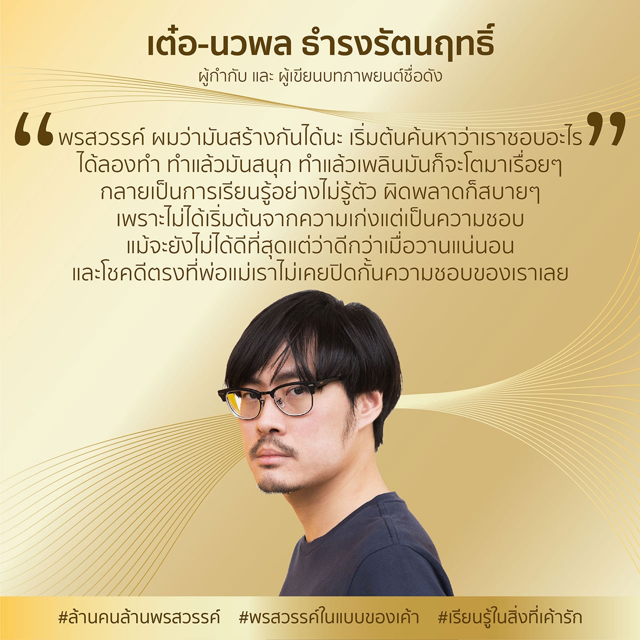 ผู้กำกับและผู้เขียนบทภาพยนตร์ชื่อดังที่กวาดรางวัลบนเวทีนานาชาติมามากมาย รวมทั้งภาพยนตร์ที่ติดทำเนียบหนังทำเงินของไทย อาทิ ‘ฟรีแลนซ์ ห้ามป่วย ห้ามพัก ห้ามรักหมอ’ และล่าสุดกับสารคดี ‘BNK48: Girls don’t cry’ เป็นต้น เล่าว่า เขาโชคดีที่มีครอบครัวที่ไม่ปิดกั้น ให้เขามีอิสระทางความคิดว่าตัวเองชอบอะไรและสนับสนุนให้เขาได้ทำสิ่งที่เขาชอบ สิ่งที่เขาทำได้ดีและประสบความสำเร็จอย่างวันนี้ เริ่มต้นมาจากการรู้จักว่า ตัวเองชอบอะไร และเริ่มเรียนรู้ฝึกฝน ตอนเด็กๆ อยากเป็นนักเขียนการ์ตูน แต่แล้วก็ค่อยๆ พบว่าตัวเองวาดรูปไม่เก่ง จนมาค้นพบว่าตัวเองสนใจกับการทำหนังภาพยนตร์ ซึ่งเขาได้เริ่มจากการเรียนรู้และฝึกฝนด้วยการซื้อหนังสือมาอ่าน หัดใช้โปรแกรมตัดต่อ แล้วก็ค่อยๆ หายืมกล้องมาเริ่มหัดถ่ายไป “ผมไม่ได้มีพรสวรรค์หรือเก่งมาแต่เกิดหรอก แต่ผมแค่ได้มีโอกาสที่จะเรียนรู้ ฝึกฝน และได้รับกำลังใจการสนับสนุนจากครอบครัวตลอดจนสร้างความสำเร็จในสิ่งที่ผมชอบ ผมว่าถ้าอยากจะประสบความสำเร็จแค่ต้องหาให้เจอว่าตัวเองถนัดอะไร พรสวรรค์จริงๆ มันอยู่บนโลกนี่แหละ มันไม่ได้อยู่บนสวรรค์ เพราะฉะนั้นมันสร้างได้อยู่แล้ว”