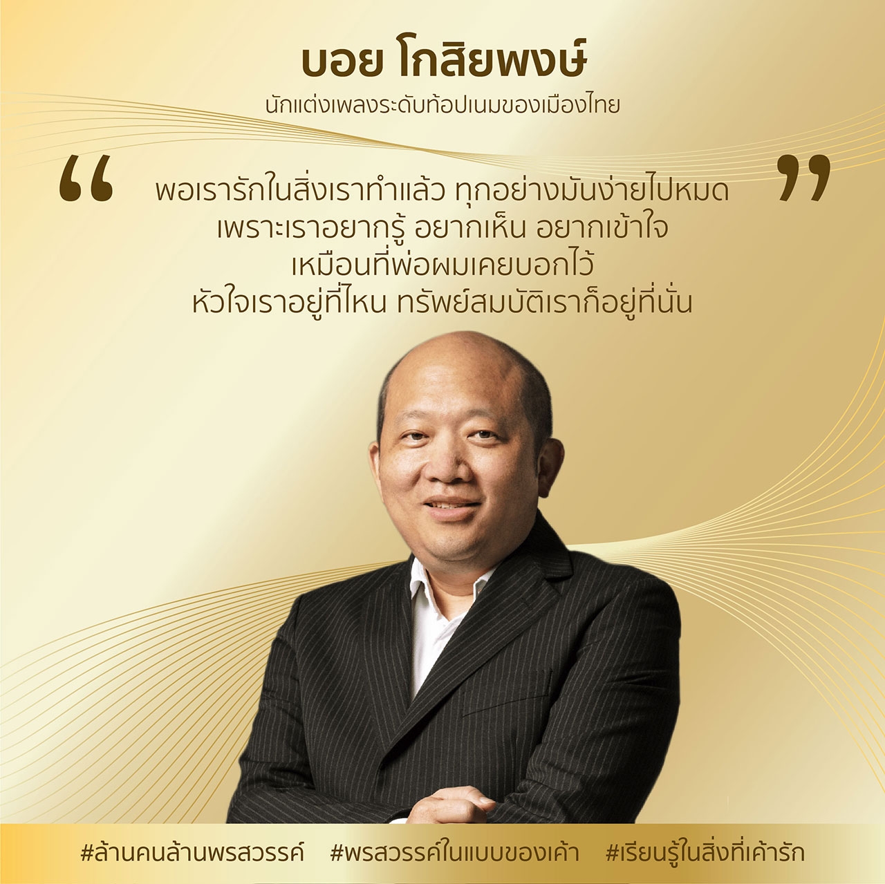 เฉกเช่นตัวอย่างคนดังต่างวัยทั้ง 6 คน จาก 6 สาขาอาชีพ ที่จะสร้างแรงบันดาลใจให้พ่อแม่ยุคใหม่เห็นความสำคัญต่อการสนับสนุนให้ลูกได้ เรียนรู้สิ่งที่เค้ารักอย่างแท้จริง.. ซึ่งถ้าลูกได้เรียนรู้สิ่งที่เค้ารัก เปรียบเสมือนการสร้างพรสวรรค์ให้เค้าผ่านการเรียนรู้ เพราะเมื่อเค้าได้เรียนรู้สิ่งที่รัก เค้าจะมีความสุข สนุกกับการเรียนรู้อย่างไร้ขีดจำกัด ต่อยอดสู่ความสำเร็จในอนาคตได้ เช่นเดียวกับเรื่องราวของคนต้นแบบต่อไปนี้นั่นเอง