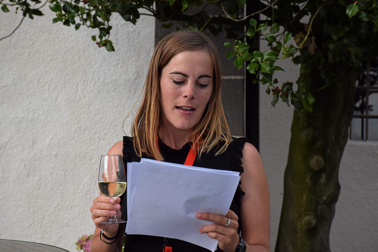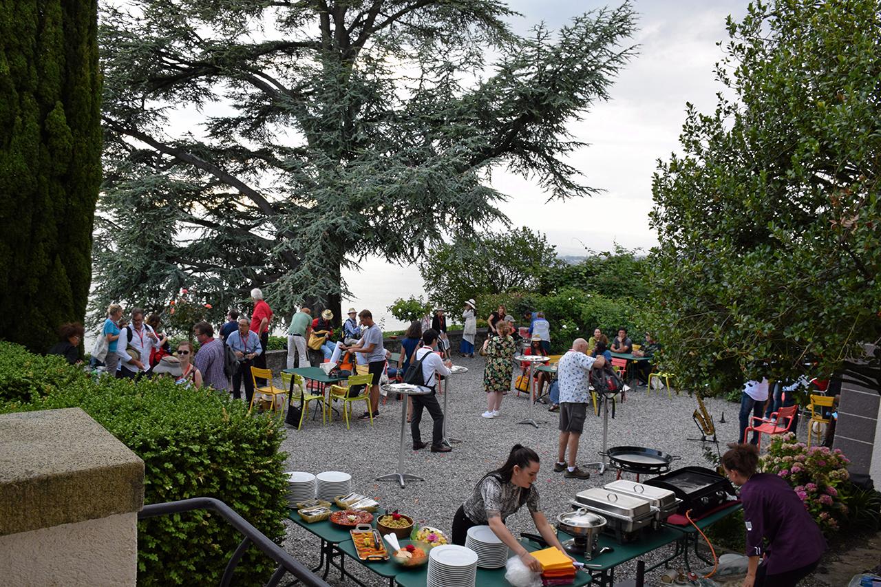 ตัวแทนครอบครัว “โจลี” (Joly) นำไวน์มาเสิร์ฟในงานเลี้ยงต้อนรับที่ Le Maison Buttin-de-Loes (buttin-de-loes.ch) จัดโดยสมาคมดูแลเขตมรดกโลกลาโวซ์ “Lavaux Patrimoine mondial” (www.lavaux-unesco.ch) และพูดเปิดงานเลี้ยงโดย Jeanne Corthay ผู้จัดการพื้นที่ (corthay@lavaux-unesco.ch) อิ่มหนำ สำราญทั้งอาหารและไวน์รสเยี่ยมพร้อมดนตรีสดคลอเบาๆ