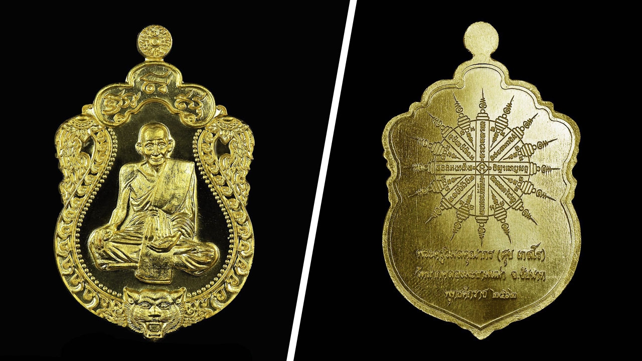 รูปแบบวัตถุมงคลที่จัดสร้างเป็นการผสมผสานระหว่างพิมพ์เหรียญเสมาใหญ่และรูปเหมือนหลวงปู่ศุข เกสโร อดีตเจ้าอาวาสวัดปากคลองมะขามเฒ่า จ.ชัยนาท พิมพ์เต็มองค์ โดยอิริยาบถของหลวงปู่ศุขอยู่ในท่านั่งขัดสมาธิราบ มือซ้ายหงายบนตัก มือขวาวางคว่ำลงที่เข่า...