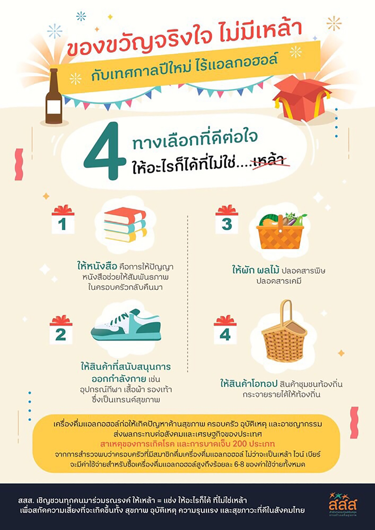 การให้ของขวัญที่ดีต่อสุขภาพกายและสุขภาพใจเป็นสิ่งที่ดี สร้างความสุขทั้งผู้ให้และผู้รับ เป็นการให้ที่ไม่ส่งผลเสียต่อใคร สสส. สคล. และภาคีเครือข่าย ร่วมส่งเสริมให้การมอบของขวัญปลอดเครื่องดื่มแอลกอฮอล์เป็นการสร้างค่านิยมที่ดีในการมอบของขวัญในวันปีใหม่นี้ เพราะการให้ของขวัญที่ดีที่สุด คือ “ของขวัญปีใหม่ ดีต่อใจ ไร้แอลกอฮอล์“ ปีใหม่นี้มาร่วมให้ของขวัญปลอดภัย งานเลี้ยงไหนก็ไม่ดื่มกันนะคะ
