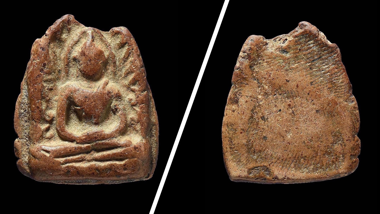 ลักษณะโดยรวมเป็นรูปทรงสี่เหลี่ยมด้านหน้าเป็นองค์พระนั่งปางปฐมศาสนา เหนือฐานบัวคว่ำบัวหงาย อยู่ในซุ้มเรือนแก้วยอดแหลม พระหัตถ์ขวายกสูงจีบนิ้วชี้นิ้วโป้งเป็นวงกลมอยู่เสมอพระอุระ พระหัตถ์ซ้ายวางเหนือพระเพลา ข้างเส้นซุ้มทั้งสองข้างมีเส้นม่านเป็นขีดแนวขวาง ด้านหลังประทับอักขระบาลีว่า ธรรมขันธ์...