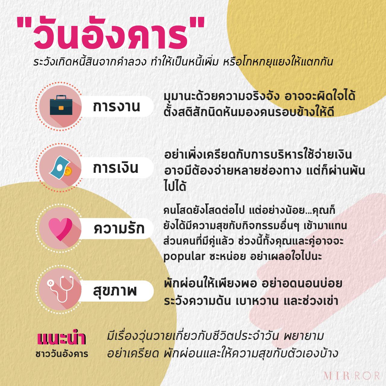 ในช่วงเดือนนี้คนเกิดวันอังคารอาจจะมีเรื่องวุ่นวายเกี่ยวกับชีวิตประจำวัน ไม่ว่าจะเป็นเรื่องงานหรือสังคม รักๆ ตัวเองค่ะ พยายาม อย่าเครียด พักผ่อนให้เพียงพอ และให้ความสุขกับตัวเองบ้างนะคะ