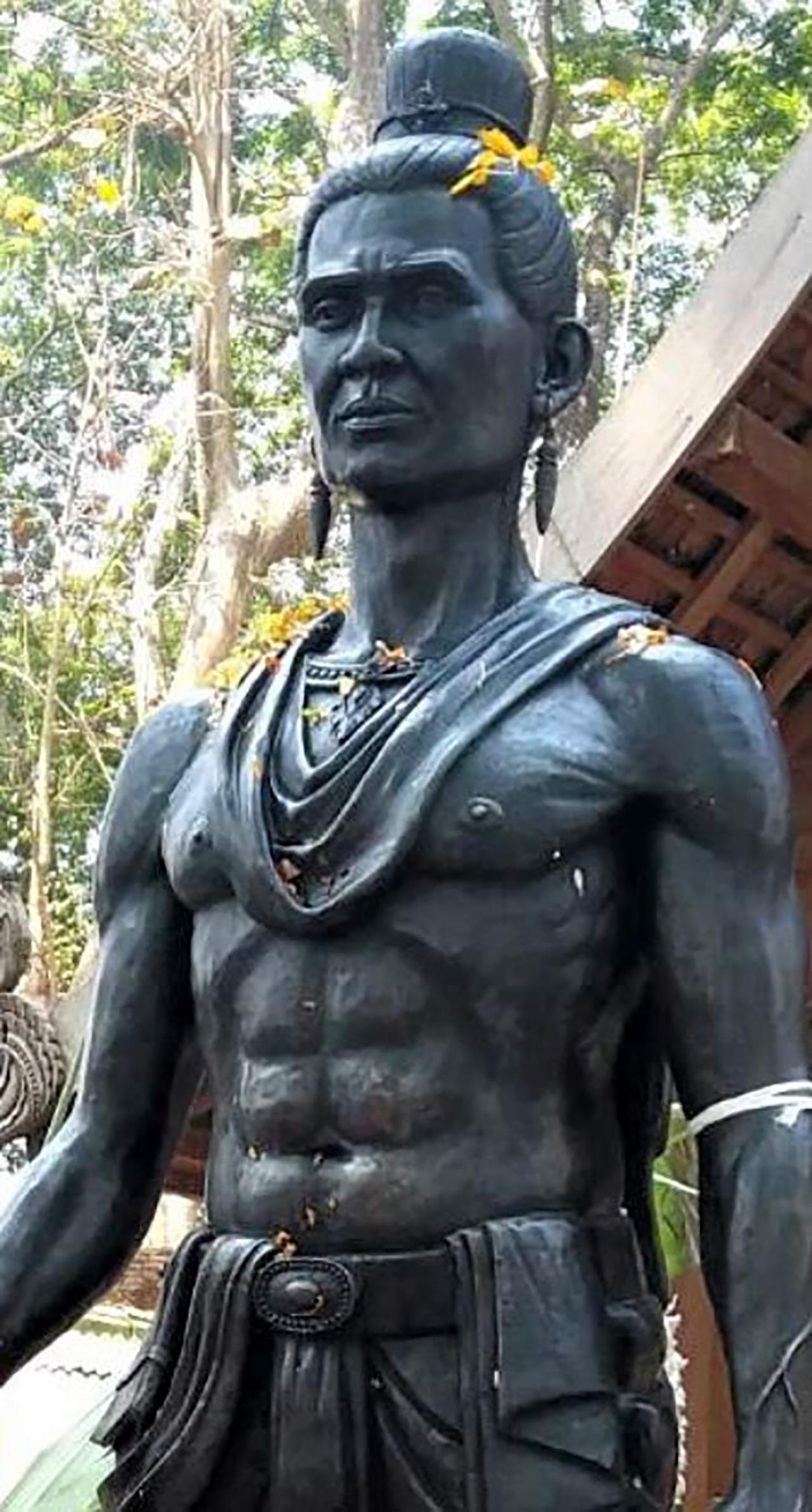 พระวรกายกำยำเยี่ยงนักรบมากพลัง ไม่ฉลองพระองค์ท่อนบน มีเพียงผ้าคล้องคอพาดไหล่สองข้าง นุ่งผ้าจีบโจงกระเบน พระหัตถ์ขวาทรงพระแสงของ้าว เกล้ามวยเหนือพระเศียรเช่นชนเผ่าทางเหนือ