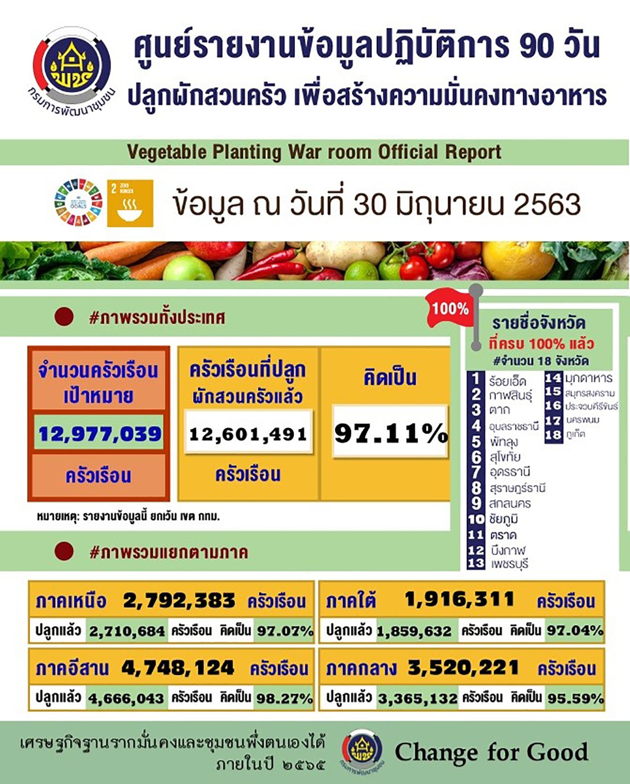 นายสุทธิพงษ์ จุลเจริญ อธิบดีกรมการพัฒนาชุมชน (พช.) กระทรวงมหาดไทย เปิดเผยว่า กรมการพัฒนาชุมชน ได้ส่งเสริมให้พี่น้องประชาชน “น้อมนำแนวพระราชดำริของสมเด็จพระกนิษฐาธิราชเจ้า กรมสมเด็จพระเทพรัตนราชสุดาฯ สยามบรมราชกุมารี สู่แผนปฏิบัติการ 90 วัน ปลูกผักสวนครัวเพื่อสร้างความมั่นคงทางอาหาร” เพื่อสร้างความมั่นคงทางอาหารในระดับครัวเรือน ลดรายจ่าย สร้างรายได้ระยะสั้นทั้งในระดับครัวเรือนและระดับกลุ่มอาชีพ โดยประกาศเป็นปฏิบัติการ Quick Win 90 วัน ในช่วงวิกฤตการณ์การแพร่ระบาดของไวรัสโคโรนา 2019 (COVID-19) ดำเนินการระหว่างวันที่ 1 เมษายน-30 มิถุนายน 2563 มีครัวเรือนเป้าหมายทั้งหมดจำนวน 12.9 ล้านครัวเรือน ซึ่งเป็นที่น่ายินดีอย่างยิ่งว่ามีพี่น้องประชาชนทั่วประเทศร่วมปลูกผักสวนครัวถึง 12,601,491 ครัวเรือน คิดเป็น 97.11% ยิ่งไปกว่านั้นมีถึง 18 จังหวัดจากทุกภาคปลูกครบ 100% ได้แก่ ร้อยเอ็ด กาฬสินธุ์ ตาก อุบลราชธานี พัทลุง สุโขทัย อุดรธานี สุราษฎร์ธานี สกลนคร ชัยภูมิ ตราด บึงกาฬ เพชรบุรี มุกดาหาร สมุทรสงคราม ประจวบคีรีขันธ์ นครพนม และภูเก็ต