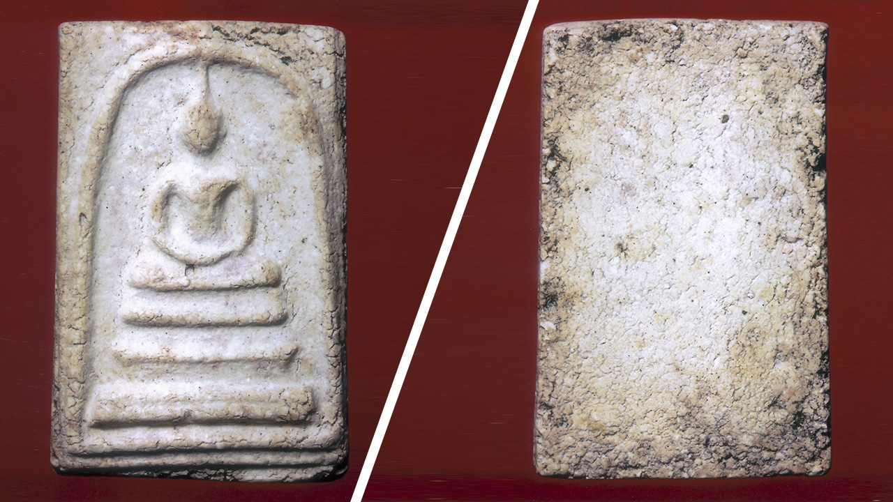 องค์นี้ขาวจริง ขาวปลอดตลอดไปทั้งด้านหน้า คนไม่เป็นพระอาจดูเป็นบางขุนพรหม ปี 09 แต่ต้องดูให้ลึกลงไปในความขาวนั้น แฝงความหม่นคล้ำ เพราะผิวแป้งโรยพิมพ์บาง เห็นจุดด่างดำประปราย รอยยุบรอยแยก ก็พอมี