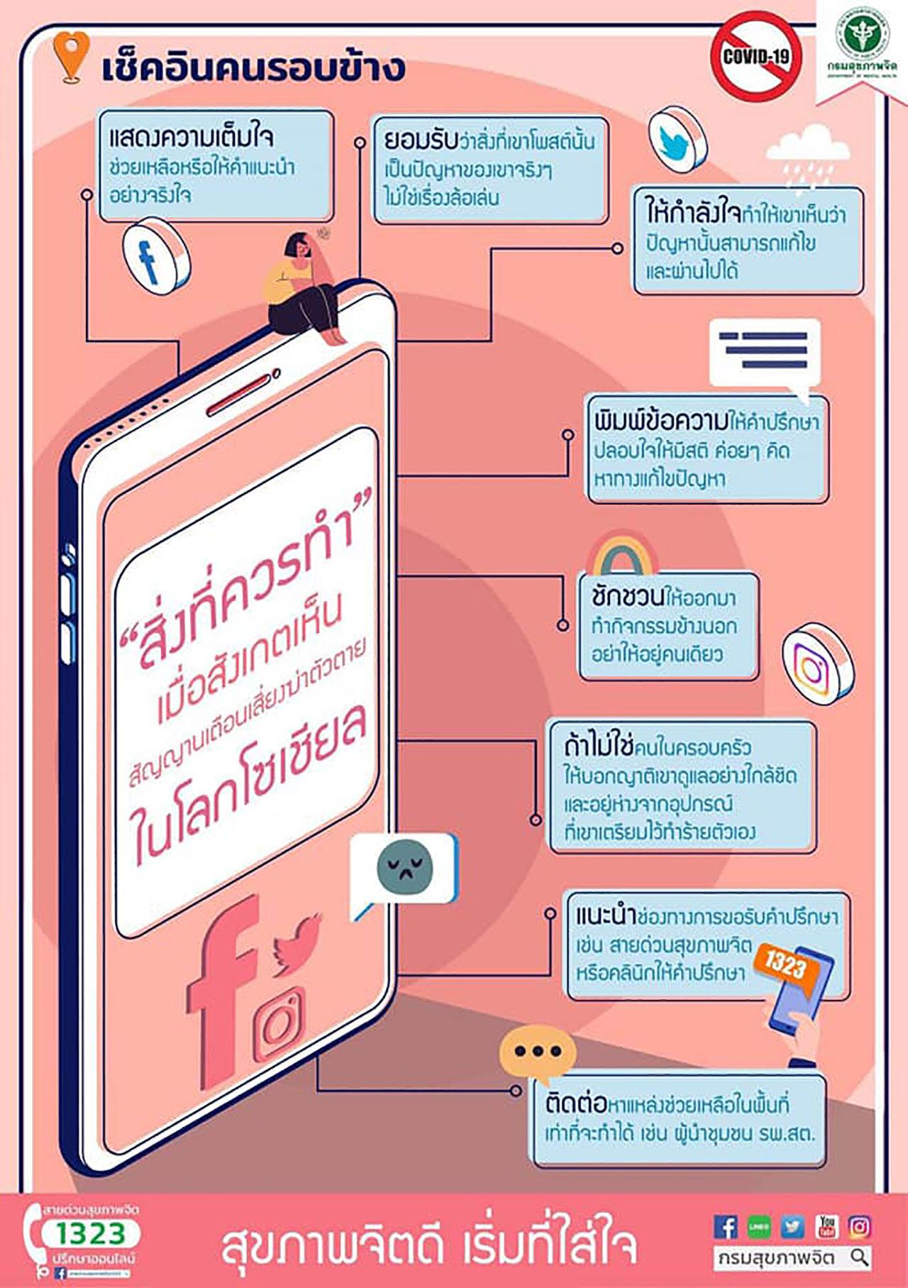 ทั้งนี้ กรมสุขภาพจิตมีคำแนะนำเรื่องนี้อย่างละเอียด คลิกดูเพิ่มเติมได้ที่เพจเฟซบุ๊กของกรมสุขภาพจิต หรือโทร 1323