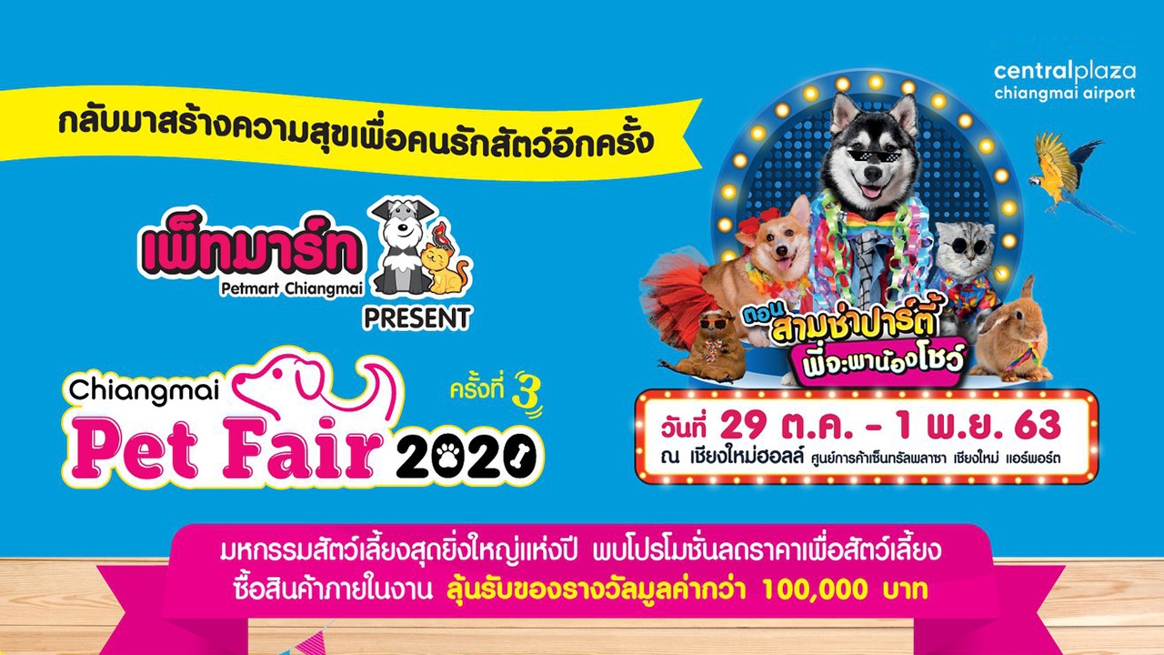 ศูนย์การค้าเซ็นทรัล พลาซา เชียงใหม่ แอร์พอร์ต ขอเชิญทุกท่านร่วมสนุกสนาน ในงานมหกรรมสัตว์เลี้ยงสุดยิ่งใหญ่ที่ทุกคนรอคอยกับงาน "Petmart Chiangmai present Chiangmai Pet Fair 2020 ตอน สามช่าปาร์ตี้ พี่จะพาน้องโชว์" เพื่อมอบความสนุกสนานและรอยยิ้มให้กับทุกท่าน อีกทั้งยังส่งเสริมความรู้ พร้อมให้คำปรึกษาแก้ไขปัญหาที่เกิดขึ้นกับสัตว์เลี้ยงแสนรักของทุกท่านผ่านกิจกรรมมากมาย