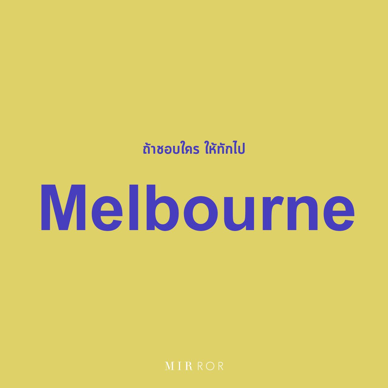 "Melbourne" ดูเผินๆ แล้วคงเป็นแค่ชื่อเมืองธรรมดาใช่ไหมคะ แต่ความจริงแล้วมันมีความหมายแอบแฝงมากกว่านั้น เป็นเพราะมีที่มาจากเพลง Melbourne ของ Morvasu เนื้อหาออกแนวรักโรแมนติก มีความน่ารักสดใสแฝงอยู่ เหมาะสำหรับคนที่เพิ่งเริ่มต้นสานความสัมพันธ์ ด้วยเนื้อหาทำนองนี้ เลยกลายเป็นวลีมุกการเล่นคำจาก Melbourne I Love you แทนที่จะพูดว่า I love you ก็ลองใช้คำว่า I Melbourne you ดูนะคะ แต่ถ้าใครยังไม่กล้าส่งคำนี้ไป ลองส่งเพลงนี้ไปให้เขาคนนั้นฟังก็ได้เหมือนกัน ไม่แน่นะว่า เขาอาจจะตอบกลับว่า I Melbourne you too ก็เป็นได้ค่ะ