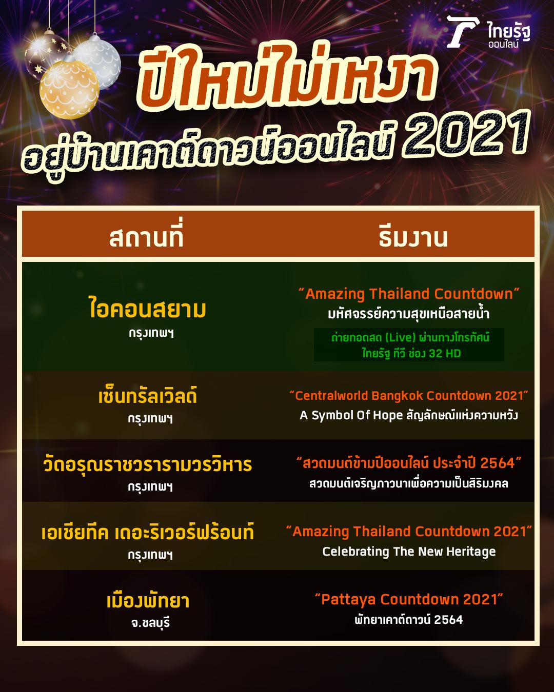 การเคาต์ดาวน์ ถือเป็นกิจกรรมไฮไลต์ที่ทั่วโลกรอคอยในเทศกาลปีใหม่ แต่ด้วยสถานการณ์แพร่ระบาดไวรัสโควิด-19 ทำให้หลายสถานที่ในประเทศไทยต้องประกาศยกเลิกการจัดงาน และเปลี่ยนรูปแบบมาจัดงานปีใหม่ออนไลน์ โดยถ่ายทอดสดผ่านทีวีดิจิทัลและแพลตฟอร์มออนไลน์ต่างๆ แทน