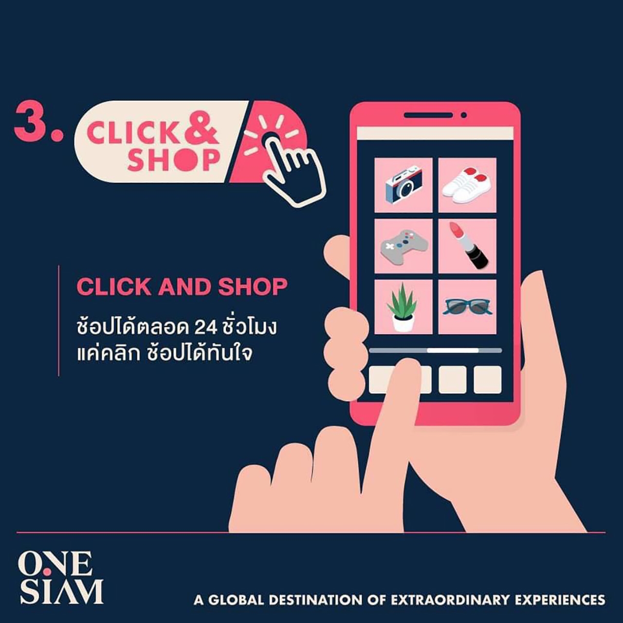 3. Click & Shop ช็อปได้ตลอด 24 ชั่วโมง แค่คลิก ช็อปได้ทันใจ บริการนี้คุณสามารถช็อปได้ทุกที่ ทุกเวลา โดยได้ คัดสรรสินค้าหลากหลายแบรนด์สุดฮิตสำหรับไลฟ์สไตล์ที่แตกต่างจาก 10 สโตร์มาแรงแห่งสยามเซ็นเตอร์และสยามดิสคัฟเวอรี่ ตั้งแต่ LOFT, The Selected, The Wonder Room, O.D.S., CAZH, ALAND, Absolute Siam Store, ICONCRAFT, Ecotopia และ JUNGSAEMMOOL โดยลูกค้าสามารถเลือกซื้อสินค้าผ่าน LINE OA OneSiam เลือก Click and Shop แล้วค้นหา “แบรนด์” หรือ “สินค้า” ที่คุณสนใจใน ONESIAM Line My Shop จากนั้นเลือกช็อปและรอรับของได้เลย