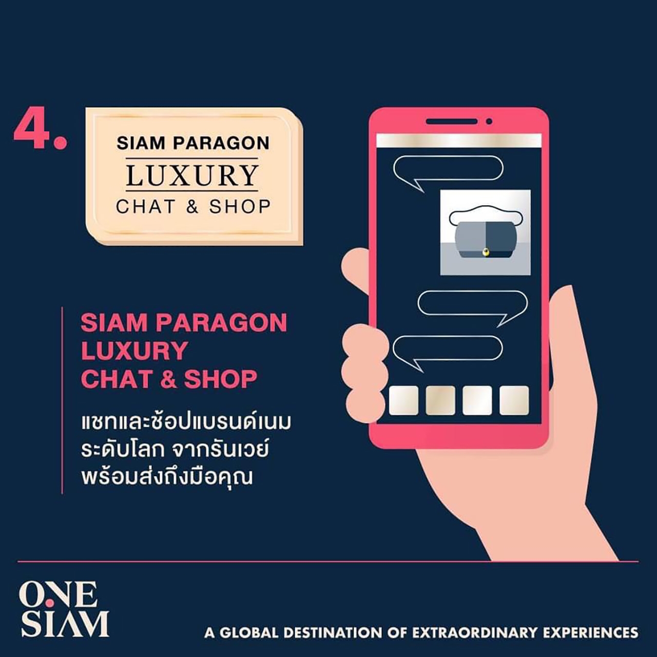 4. Siam Paragon Luxury Chat & Shop แชตและช็อปแบรนด์เนมระดับโลก จากรันเวย์พร้อมส่งถึงมือคุณ โดยกดติดตามผ่านทางแฟนเพจเฟซบุ๊ก SIAMPARAGONSHOPPING และทาง Line @ONESIAM จากนั้นเลือกชมสินค้าไฮไลต์ประจำวันของหลากหลายแบรนด์หรูคอลเลกชันล่าสุดตามสไตล์ความชอบ โดยสามารถพูดคุยสอบถามรายละเอียดต่างๆ ด้วยการแชตผ่านข้อความกับผู้ช่วยส่วนตัว เมื่อตัดสินใจเลือกสินค้าแล้วจึงเลือกชำระเงินตามเงื่อนไข และช่องทางของแต่ละแบรนด์
