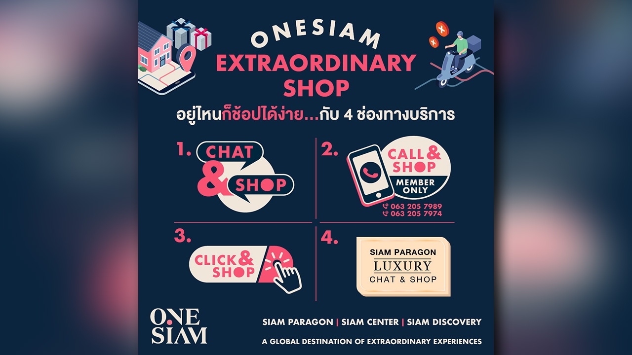 ONESIAM โกลบอลเดสติเนชั่นที่ผสานศักยภาพของ 3 ศูนย์การค้า ได้แก่ สยามพารากอน สยามเซ็นเตอร์ สยามดิสคัฟเวอรี่ ตอบสนองความต้องการของลูกค้าในทุกสถานการณ์ สอดคล้องและสนับสนุนนโยบายรัฐเพื่อป้องกันการแพร่ระบาดของไวรัสโควิด-19 ให้ทุกคนได้ Work from Home อย่างมีความสุขและเติมเต็มสีสันให้กับชีวิต เปิดบริการที่เข้าใจพฤติกรรมลูกค้าในภาวะปัจจุบัน ด้วยโปรแกรมช็อปสุดพิเศษ “ONESIAM Extraordinary Shop” (วันสยาม เอ็กซ์ตร้าออดินารี่ ช็อป) ยกระดับประสบการณ์ช็อปปิ้งให้สะดวกล้ำเหนือระดับ อยู่ไหนก็ช็อปได้ง่าย รวมสินค้าหลากหลาย ตอบครบทุกความต้องการ ตั้งแต่ Fashion, Beauty, Living, Lifestyle, Gadget และอาหารเมนูโปรดของร้านที่คุณชื่นชอบ รวมกันให้คุณเลือกช็อปถึง 4 ช่องทางบริการ ได้แก่