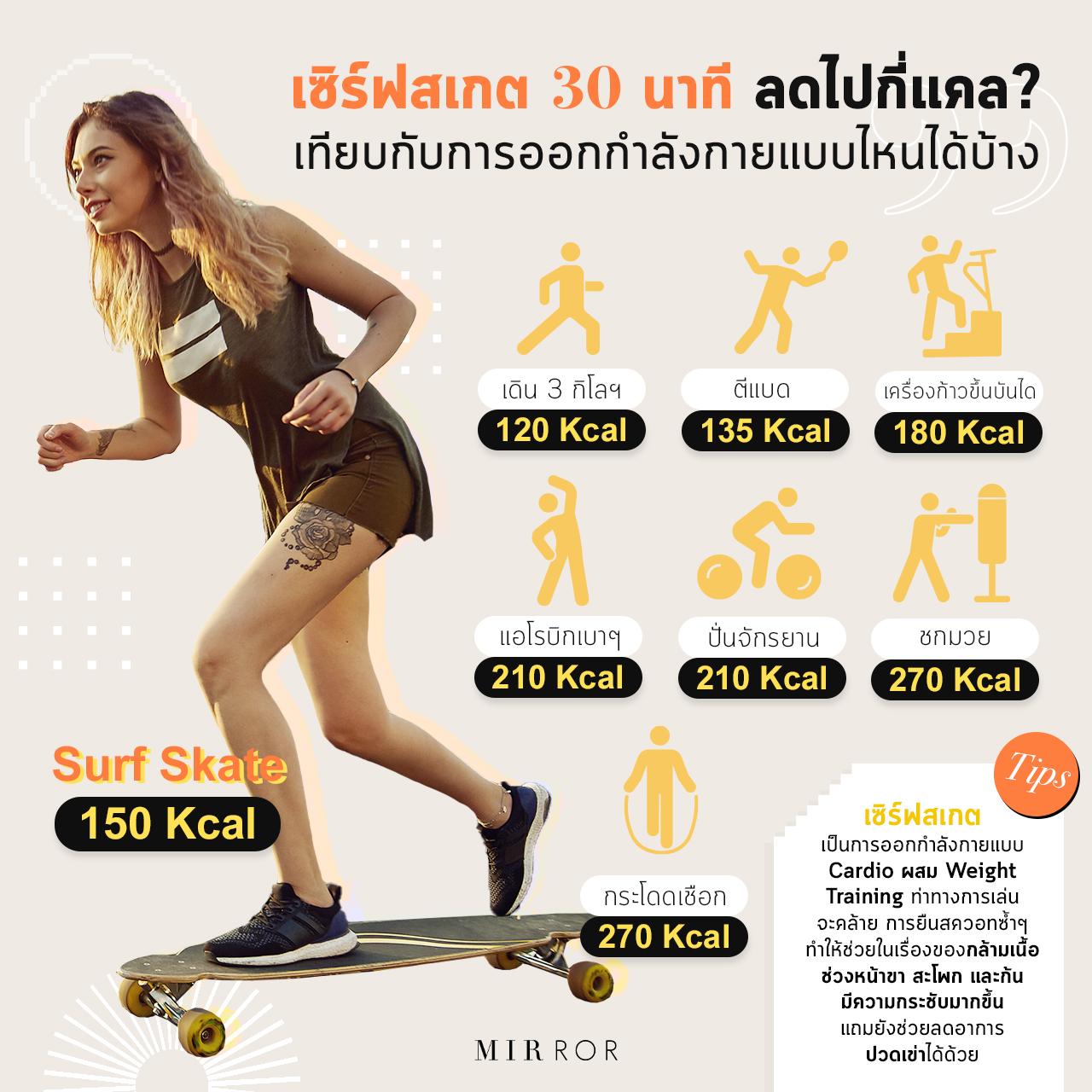 ซึ่งถ้าเราเล่นเซิร์ฟสเกต 30 นาที เราจะสามารถเผาผลาญได้ 150 Kcal แต่ถ้าใครยังรู้สึกว่ายังไม่ถนัดเล่นกีฬาชนิดนี้ ก็ยังมีกีฬาอีกหลายชนิดที่สามารถเผาผลาญแคลอรีได้เหมือนกัน