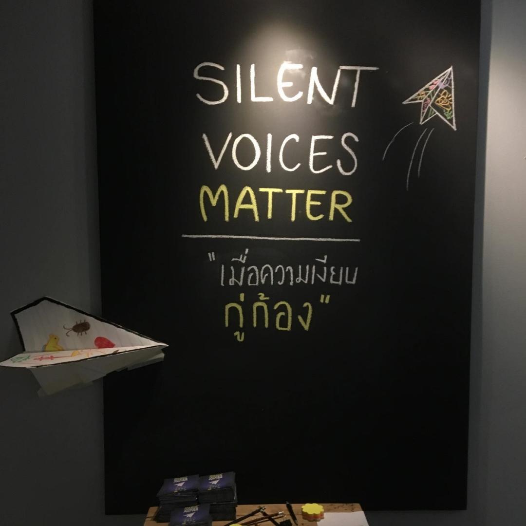 Silent Voices Matter “เมื่อความเงียบกู่ก้อง” จัดโดยกลุ่มหิ่งห้อยน้อย เป็นหนึ่งในนิทรรศการที่มีความน่าสนใจงานหนึ่ง ในนิทรรศการเต็มไปด้วยผลงานศิลปะหลากหลายแขนง ตั้งแต่ภาพถ่าย, คอมพิวเตอร์กราฟิก, งานเพนติ้ง, งานปั้นเซรามิก และสื่อผสม โดยงานทุกชิ้นจะเชื่อมโยง บอกเล่า นำเสนอมุมมองว่าเสียงของเด็กทุกคนล้วนมีความหมาย และทุกเสียงจะต้องถูกได้ยิน