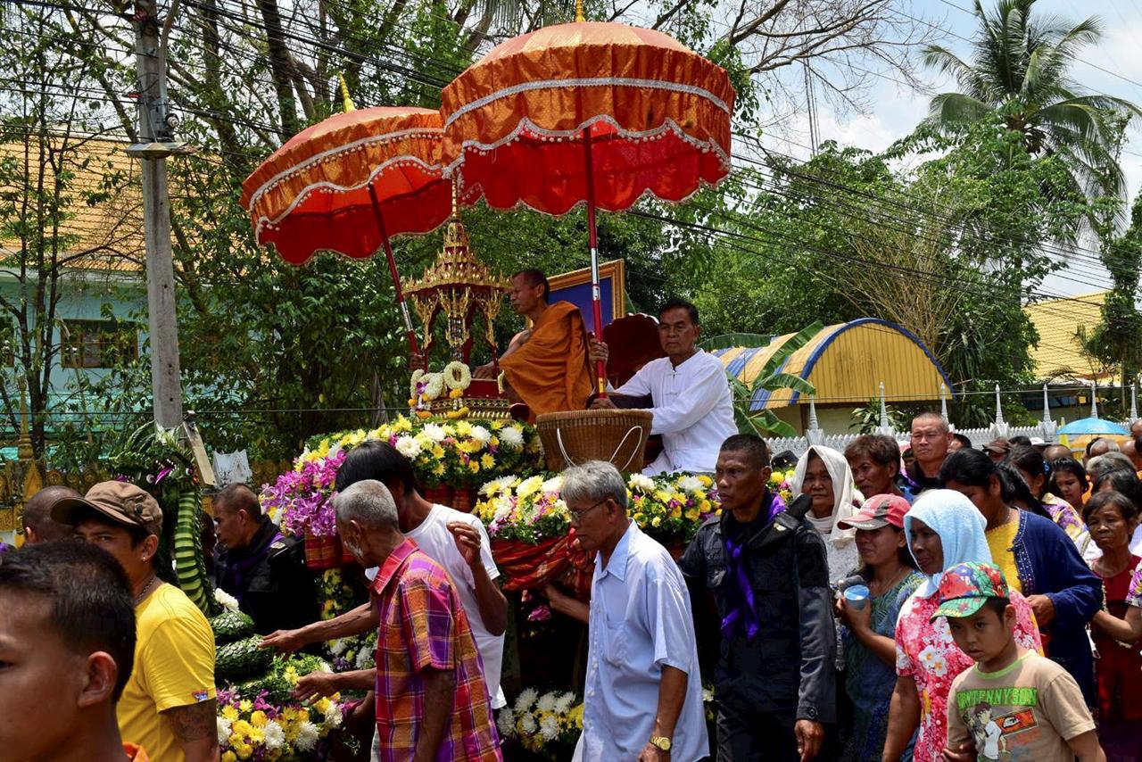 แต่เมื่ออาราธนา “หลวงพ่อตาตน” ขึ้นบนหลังช้างแล้วขบวนออกจากวัดสำโรงเกียรติ ราว 500 เมตร ที่กำลังจะข้าม “สะพานห้วยทา” จู่ๆก็ได้เกิดปาฏิหาริย์ขึ้นมีลมพายุพัดมาทั้ง 4 ทิศ ฝนตกลงมาอย่างหนัก และเสียงฟ้าร้องคำรามราวกับแผ่นดินจะถล่ม ทำให้ “ช้าง ม้า” ต่างพากันหมอบกราบลงกับพื้น