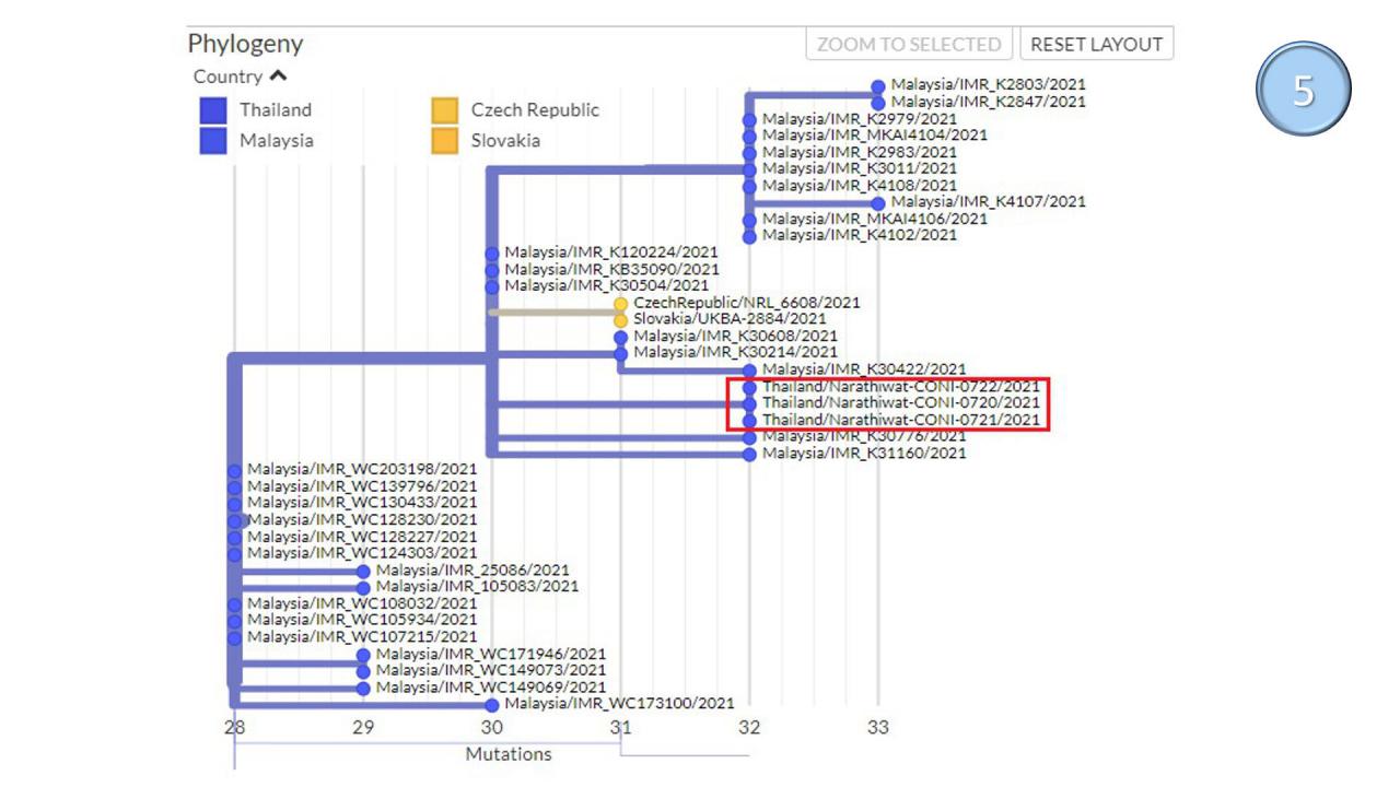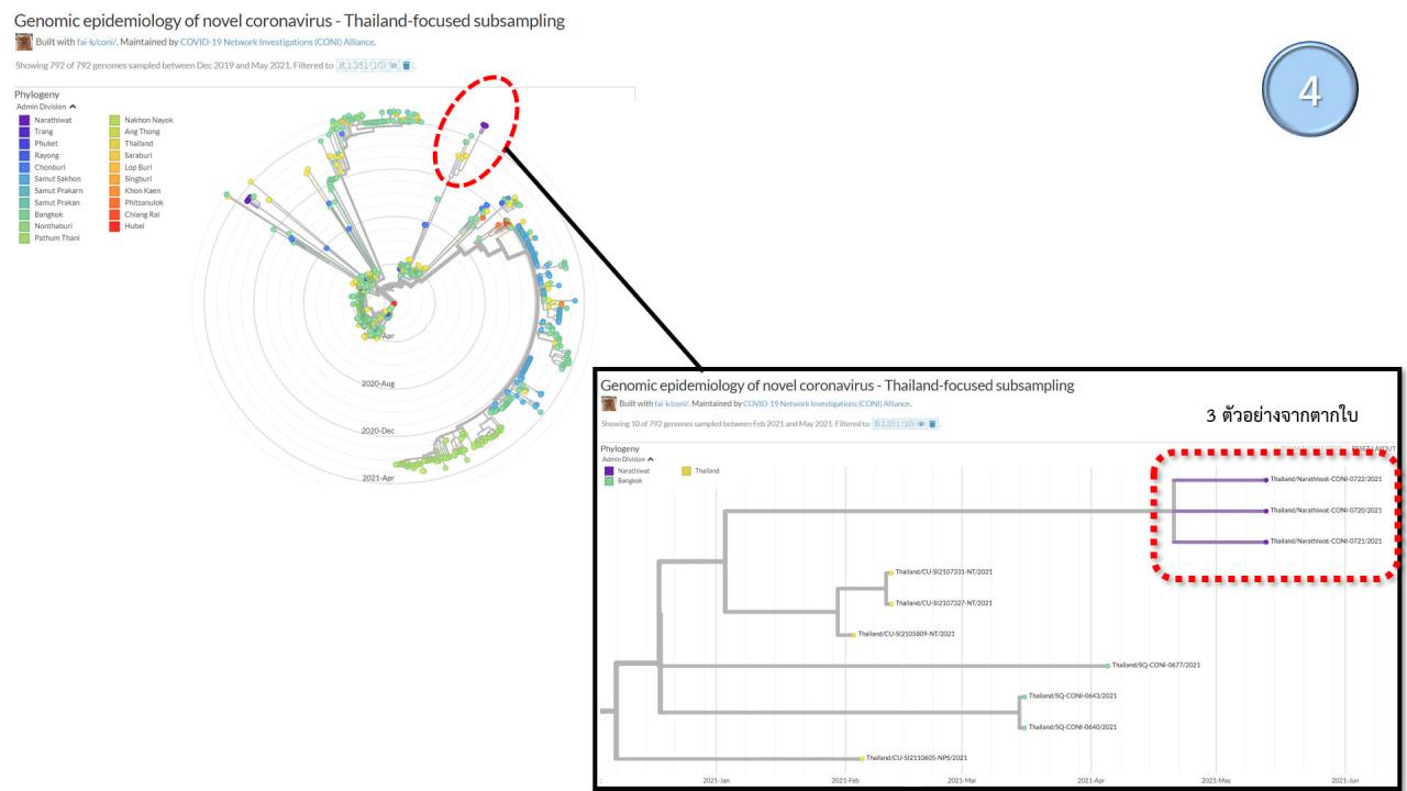 ต้นไม้วิวัฒนาการชาติพันธุ์ (Phylogenetic Tree) ของ 3 ตัวอย่างจากการสุ่มตรวจถอดรหัสพันธุกรรมทั้งจีโนมจากผู้ติดเชื้อจากตากใบ ซึ่งพบว่าเป็นสายตระกูลแอฟริกาใต้ B.1.351 ซึ่งมีความคล้ายคลึงกันอยู่ในคลัสเตอร์เดียวกัน