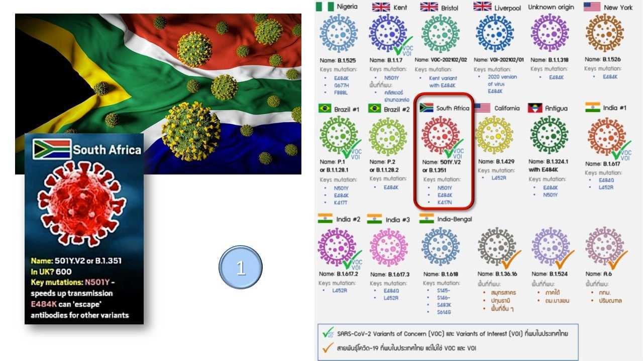 โควิดระบาดรอบ 3 ของประเทศไทย ตั้งแต่ช่วงเดือนเมษายน 2564 เป็นต้นมา พบสายพันธุ์อังกฤษ B.1.1.7 มากที่สุด แต่อย่างไรก็ดี มีข่าวพบสายพันธุ์อินเดีย และสายพันธุ์แอฟริกาใต้ในบางคลัสเตอร์ ซึ่งสายพันธุ์นี้มีตำแหน่งกลายพันธุ์ที่ถูกจัดให้อยู่ในกลุ่มสายพันธุ์ที่น่ากังวลระดับโลก (Variants of Concern : VOC) ดังนั้นใครที่อยู่ใกล้ชิดกับกลุ่มเสี่ยงต้องระมัดระวังตัวอย่างยิ่ง