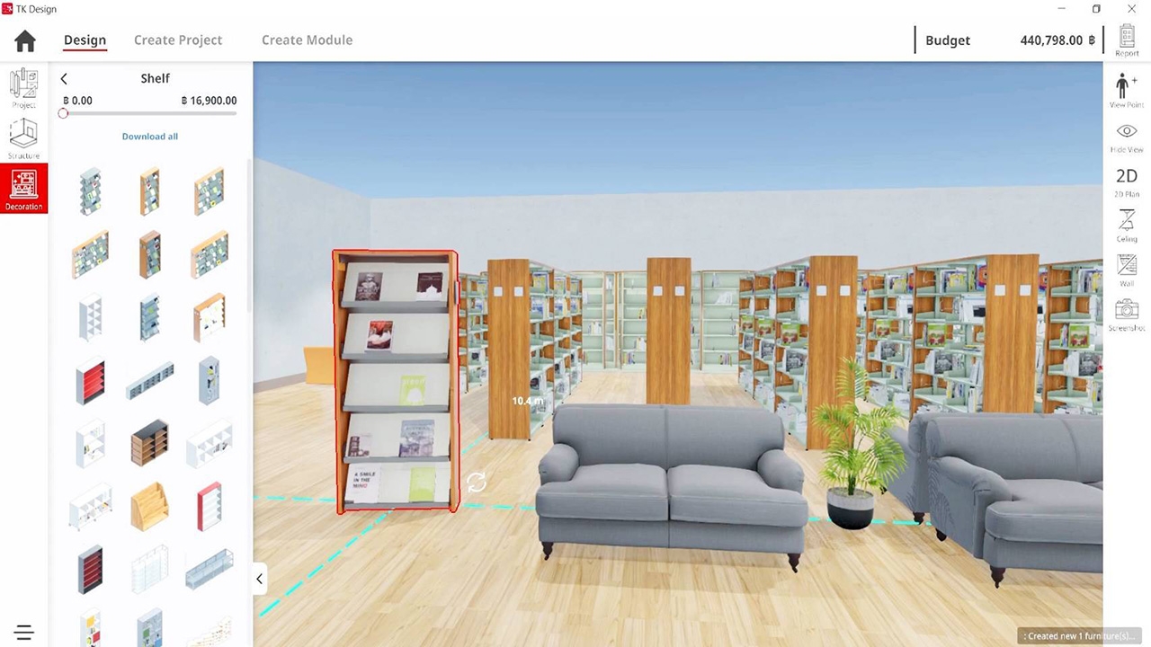 นอกจากนั้นยังเปิดตัว TK Design เครื่องมือสร้างสรรค์พื้นที่เรียนรู้ เหมาะสำหรับผู้สนใจการสร้างสรรค์ศูนย์เรียนรู้ในระดับท้องถิ่น และอยากทดลองออกแบบพื้นที่ในการเรียนรู้ ห้องสมุด มุมเรียนรู้ ด้วยฝีมือตนเองแบบทำได้จริง ด้วยเครื่องมือที่ใช้งานง่ายร่วมกับโปรแกรม 3D เริ่มตั้งแต่การกำหนดพื้นที่ใช้งาน รูปแบบดีไซน์ เพื่อช่วยให้เห็นภาพรวมชัดเจน ก่อนตกแต่งพื้นที่ด้วยการเลือกอุปกรณ์ที่จำเป็น เช่น โต๊ะอ่านหนังสือ เก้าอี้ ตู้เก็บหนังสือ มุมวางของได้ตามใจผู้ออกแบบเพราะสามารถเลือก วาง เพิ่ม หรือลบทิ้ง ได้ในคลิกเดียว และยังมีจุดเด่นเรื่องการคำนวณราคาเฟอร์นิเจอร์เบื้องต้น เพราะมีเครื่องมือช่วยประมาณการเป็นแนวทางการบริหารค่าใช้จ่ายได้อีกด้วย โดยผู้ใช้งานสามารถดาวน์โหลดโปรแกรมเพื่อใช้งานบนคอมพิวเตอร์ ได้ที่ vr.tkpark.or.th