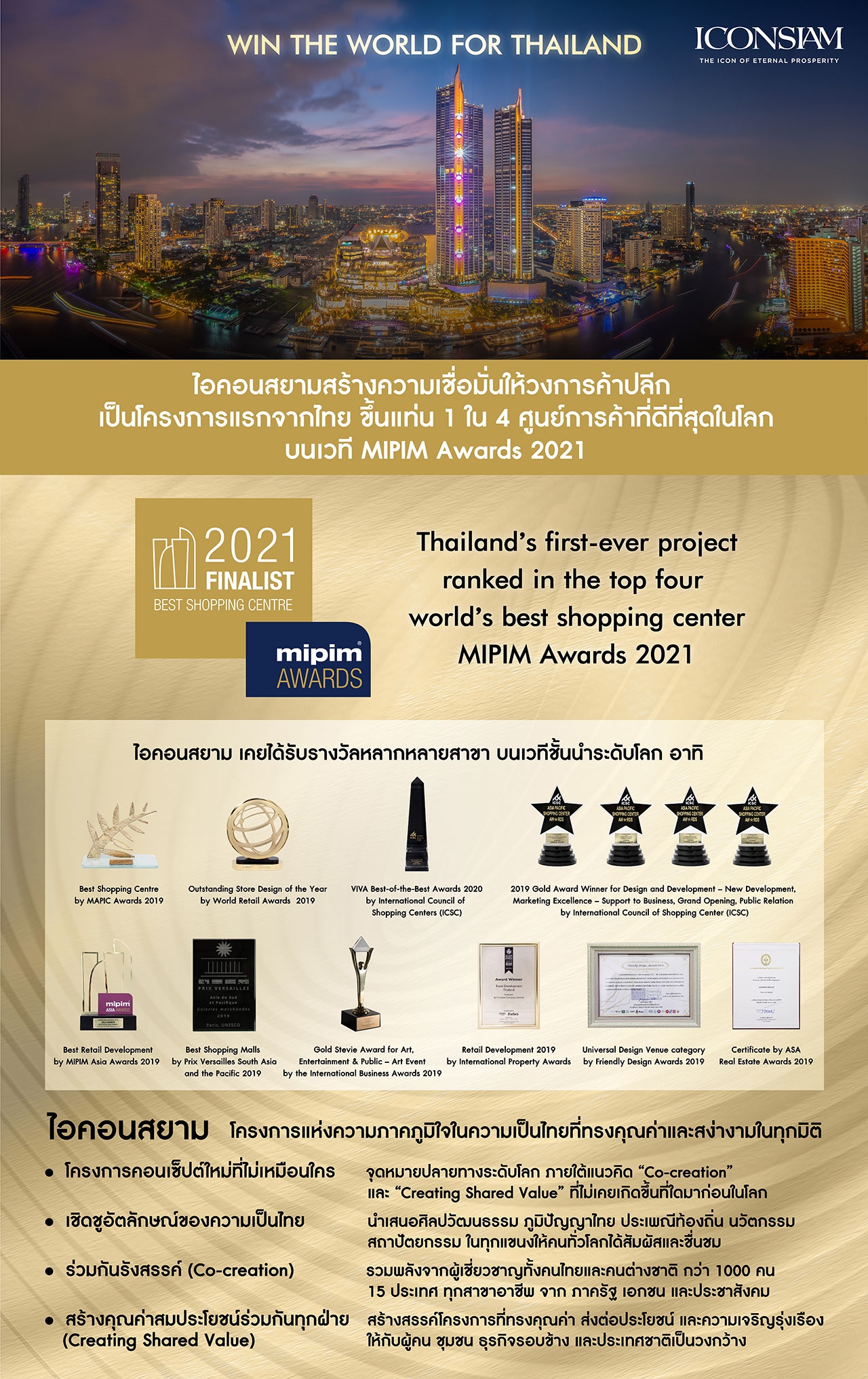กรุงเทพฯ (9 กันยายน 2564) – ไอคอนสยาม อภิมหาโครงการเมืองแห่งการใช้ชีวิตสู่โลกอนาคต โดยเจ้าของโครงการคือ กลุ่มบริษัทสยามพิวรรธน์ เครือเจริญโภคภัณฑ์ และ แมกโนเลีย ควอลิตี้ ดีเวล็อปเม้นต์ คอร์ปอเรชั่น ออกแบบโดย บริษัท เออร์เบิ้น อาร์คิเต็คส์ จำกัด ตอกย้ำความมุ่งมั่นที่จะสร้างไอคอนสยามให้เป็นศูนย์รวมทุกมิติของภูมิปัญญาคนไทย ศิลปวัฒนธรรมของประเทศไทยไปแข่งขันระดับโลก ได้ขึ้นแท่นเป็น 1 ใน 4 ศูนย์การค้าที่ดีที่สุดของโลก บนเวทีประกวดอสังหาริมทรัพย์ MIPIM Awards 2021 ซึ่งเป็น Global Awards ที่มีมานานกว่า 30 ปี เมื่อวันที่ 8 กันยายน ณ เมืองคานส์ (Cannes) ประเทศฝรั่งเศส โดยนับว่าเป็นครั้งแรกของโครงการอสังหาริมทรัพย์เพื่อการค้าปลีกจากประเทศไทยที่ได้รับเกียรตินี้