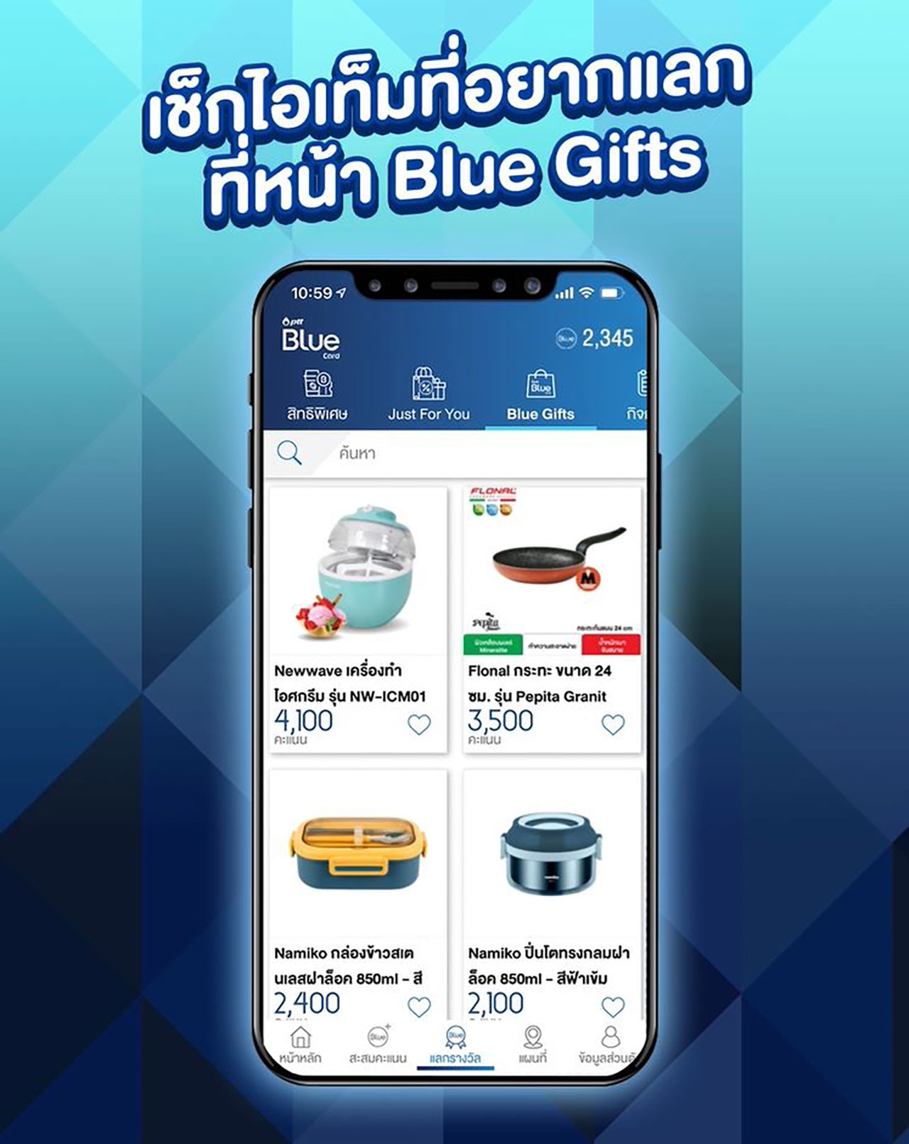 สามารถเช็กคะแนนสะสมแลกรับสินค้า Blue Gifts มากมาย ไม่ว่าจะเป็น Gadget เครื่องใช้ไฟฟ้า อุปกรณ์ออกกำลังกาย ไปจนถึงเครื่องครัว พร้อมจัดส่งถึงบ้าน หรือ รับสินค้าเองที่ร้าน 7-Eleven ในสถานีบริการ พีทีที สเตชั่น ใกล้บ้าน แถมมีสินค้าให้เลือกทั้งของใช้ในชีวิตประจำวัน สินค้าอิเล็กทรอนิกส์มากมาย ไปจนถึงสร้อยคอทองคำ เป็นต้น