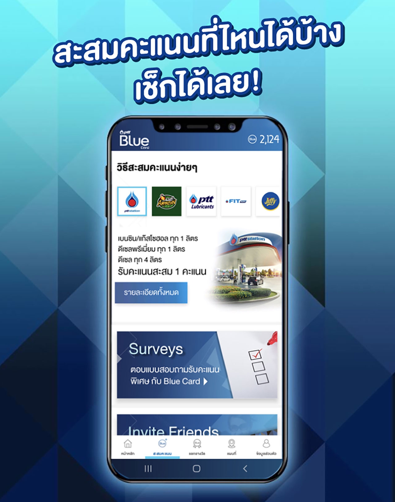 เมนูนี้บอกรายละเอียดวิธีการสะสมคะแนน Blue Card ที่สถานีบริการ พีทีที สเตชั่น และร้านค้าในเครือ OR ได้แก่ Café Amazon, Texas Chicken, ฮั่วเซ่งฮงติ่มซำ, Jiffy, PEARLY tea และ FIT Auto