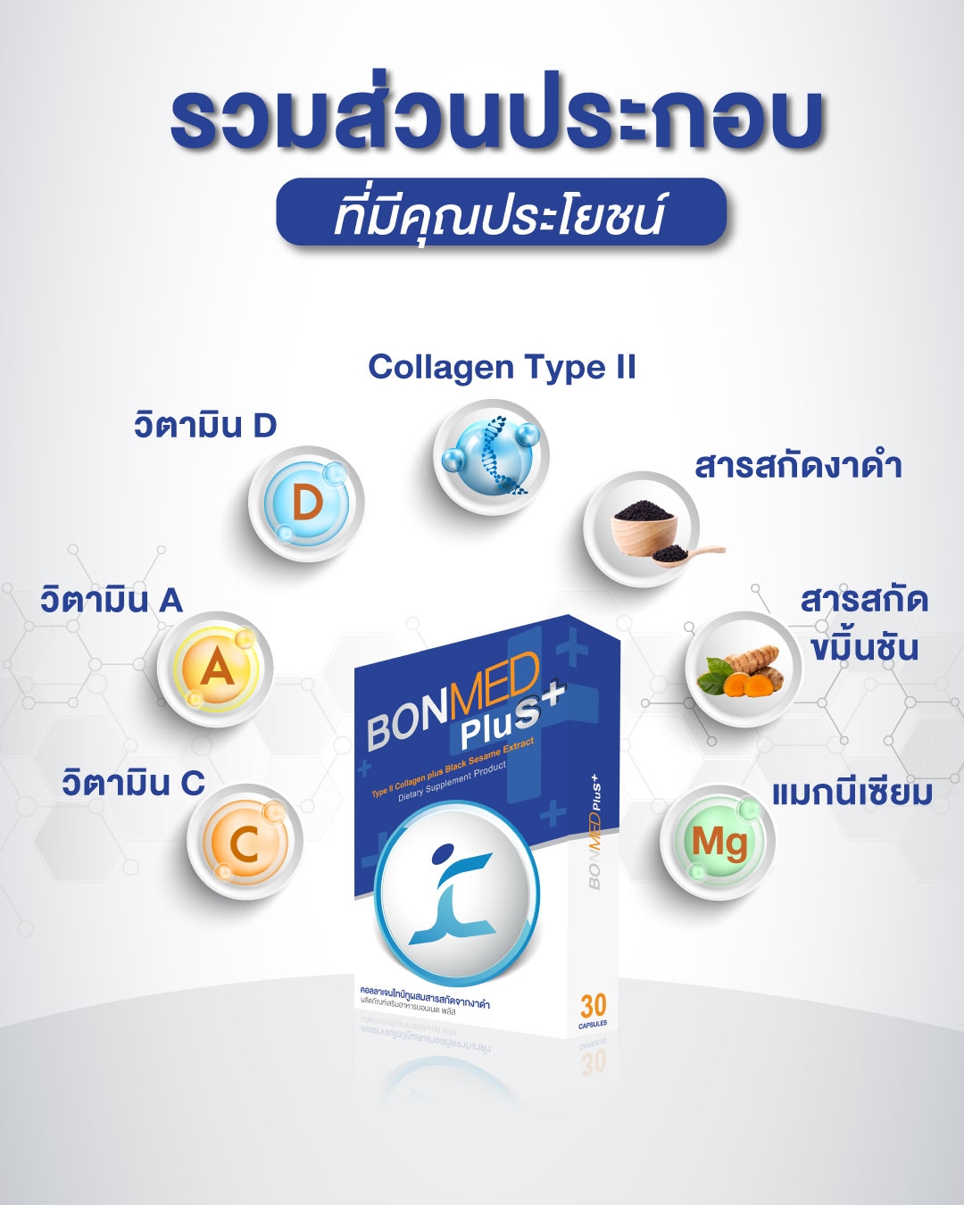 ทั้งนี้ หากใครที่ต้องการความมั่นใจมากยิ่งขึ้น อีกหนึ่งผลิตภัณฑ์ที่น่าสนใจในเวลานี้ก็คือ “BONMED PLUS+ (บอนเมด พลัส)” ผลิตภัณฑ์เสริมอาหารในรูปแบบแคปซูล ที่มีส่วนผสมจากวัตถุดิบธรรมชาตินานาชนิด อาทิ วิตามินดี 3, วิตามินซี, วิตามินเอ, แมกนีเซียม, สารสกัดงาดำ, สารสกัดขมิ้นชัน รวมไปถึงคอลลาเจนไพพ์ทูชนิดพิเศษ “คอลลาเจน-ยูซีทู (Collagen UCII)” จากกระดูกอ่อนของอกไก่ เป็นคอลลาเจนที่มีโครงสร้างคล้ายมนุษย์มากที่สุดในบรรดาคอลลาเจนจากสัตว์ปีกทั้งหมด สกัดออกมาโดยใช้กรรมวิธีสิทธิบัตรจากสถาบันวิจัยลอนซ่า สหรัฐอเมริกา ซึ่งคุณประโยชน์จากธรรมชาติเหล่านี้ล้วนถูกคัดสรรมาเป็นอย่างดี ผ่านการวิจัย พัฒนา และผลิตด้วยกระบวนการสากล มาตรฐาน GMP และยังจดทะเบียนอาหารกับสำนักงานคณะกรรมการอาหารและยา (อย.) อย่างถูกต้อง