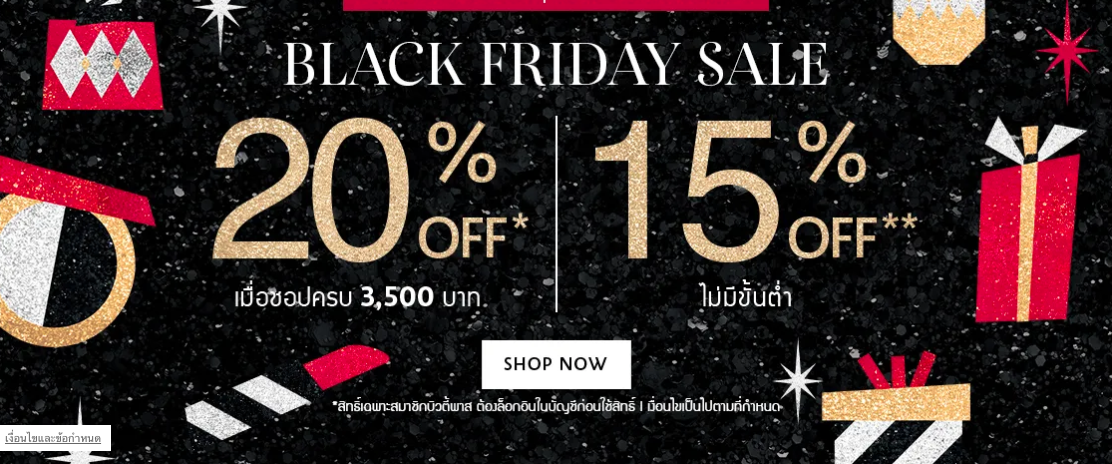 Sephora Black Friday ลด 20% เมื่อซื้อสินค้าครบ 3,500 บาท และเว็บไซต์ลด 15% ไม่มีขั้นต่ำ สำหรับการซื้อบน Sephora.co.th และแอปพลิเคชัน Sephora ตั้งแต่วันที่ 26 - 28 พ.ย. 2021 เฉพาะสมาชิก Beauty Pass 1 บัญชีต่อ 1 สิทธิ์สั่งซื้อ 1 ครั้ง ทราบโปรแล้วรีบกด Holiday Set รัวๆ