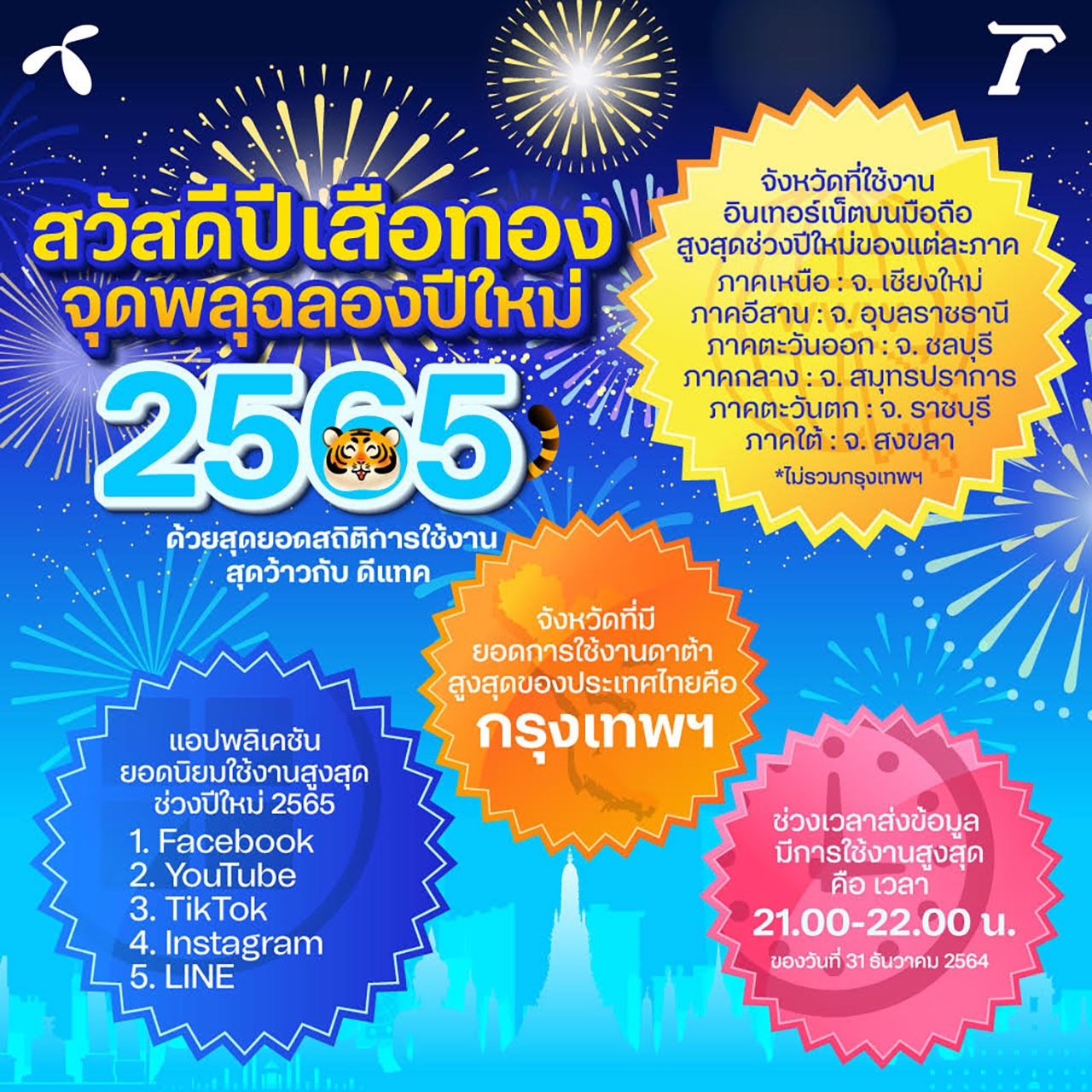 สวัสดีปีเสือทอง ฉลองต้อนรับปีใหม่ 2565 กับสถิติการใช้งานสุดว้าวในคืนเคาต์ดาวน์หรรษากับดีแทคผ่านช่วงเวลาส่งท้ายปีเก่าต้อนรับปีใหม่กันไปไม่นาน เรามาเริ่มต้นวันแรกในปีใหม่ด้วยการดูสถิติสุดฮิตกันว่าจังหวัดใดจะใช้งานข้อมูลในคืนเคาต์ดาวน์มากที่สุด ซึ่งปรากฏว่าจังหวัดที่ยังครองแชมป์ในครั้งนี้เป็นทางด้าน "กรุงเทพมหานคร" ที่ใช้งานอินเทอร์เน็ตมือถือเป็นอันดับต้นๆ ในวันส่งท้ายปี โดยช่วงที่มีผู้คนอวยพรกันหนาแน่นที่สุดจะเกิดในช่วงประมาณ 21.00-22.00 น. พร้อมกับยังมีแอปพลิเคชันยอดฮิตที่ทำให้ใครหลายคนติดใจใช้งานตลอดทั้งวันในช่วงเทศกาล