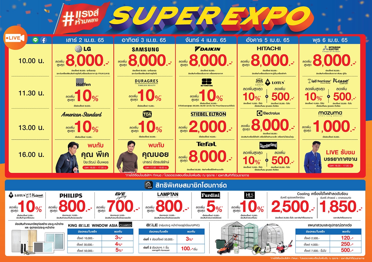 งาน HomePro SUPER EXPO ครั้งนี้ จะจัดขึ้นตั้งแต่วันที่ 2 เมษายน 65-6 เมษายน 65 รวม 5 วันเท่านั้น พบความพิเศษจากขบวนสินค้าเรื่องบ้าน และของตกแต่งบ้าน อัปเดตเทรนด์ใหม่รับหน้าร้อน ครบครันทุกแผนกให้เลือกสรร ไม่ว่าจะเป็น เครื่องใช้ไฟฟ้า, เฟอร์นิเจอร์, อุปกรณ์ห้องน้ำ, อุปกรณ์ครัว, ชุดห้องนอน, ห้องนั่งเล่น, สวน และอุปกรณ์ตกแต่ง, สินค้าปรับปรุง และซ่อมแซมบ้าน และอีกมากมาย พร้อมคุ้มค่ากว่าครั้งไหน ๆ #แรงส์ห้ามพลาด !! กับสินค้า Super Deal ลดสูงสุดถึง 80% คอมโบความคุ้มต่อเนื่องกับสินค้าแบรนด์ชั้นนำใน Super Brand ลดเพิ่มสูงสุดอีก 10%!!