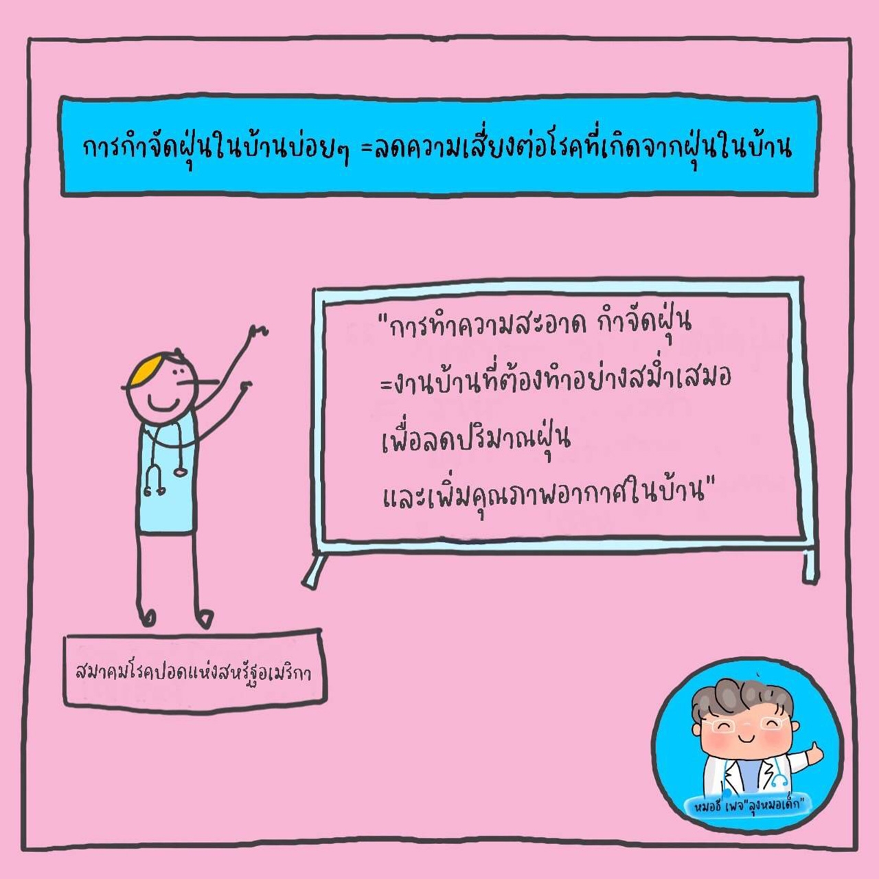 อยู่ในบ้านยิ่งเยอะเท่าไรก็ยิ่งเพิ่มความเสี่ยงในการเกิดโรคที่เกิดจากฝุ่นเท่านั้น วิธีที่ดีที่สุดในการป้องกัน คือ การทำความสะอาดบ้านอยู่เสมอ หมั่นถูพื้นเป็นประจำ เพื่อลดการสะสมของฝุ่น สมาคมโรคปอดแห่งสหรัฐอเมริกาแนะนำให้รวมการทำความสะอาด กำจัดฝุ่นเป็นงานบ้านที่ต้องทำอย่าง "สม่ำเสมอ" ซึ่ง จะช่วยลดปริมาณฝุ่นและทำให้คุณภาพอากาศในบ้านดีขึ้น โดยใช้เวลาเพียงไม่กี่นาทีในแต่ละวันเท่านั้น แต่ปัจจุบันพบว่า บางบ้านทำความสะอาดพื้นแค่สัปดาห์ละไม่กี่ครั้ง หรือรอให้เห็นหรือสัมผัสได้ว่าฝุ่นมีปริมาณมากแล้วค่อยถู ซึ่ง"ไม่เพียงพอ" เพราะฝุ่นในบ้านเกิดขึ้นได้ตลอดเวลา จึงมีการสะสมฝุ่นใหม่ขึ้นมาอย่างรวดเร็ว นอกจากนั้น ในแต่ละวันที่เราเข้าบ้านจะมีฝุ่นที่ติดตามเสื้อผ้า รองเท้าเข้ามาในบ้านได้ หรือแม้กระทั่งฝุ่นที่เล็ดลอดหรือลอยเข้ามาตามประตู หน้าต่างที่เปิดทิ้งไว้ อย่าลืมนะครับ การที่เรา "มองไม่เห็น" ฝุ่น ไม่ได้แปลว่าไม่มี จริงๆ แล้วมี เพียงแต่เรามองไม่เห็นเท่านั้น