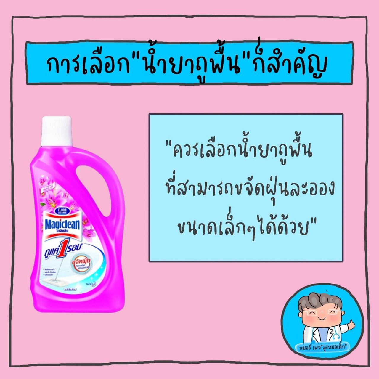 สำหรับการเลือกน้ำยาถูพื้นก็มีความสำคัญ ควรเลือกน้ำยาถูพื้นที่สามารถขจัดฝุ่นละอองขนาดเล็กๆ ได้ด้วย เพื่อให้มั่นใจได้ว่าการถูพื้นในแต่ละครั้ง สามารถขจัดฝุ่นได้สะอาด และมีประสิทธิภาพมากพอ และที่สำคัญที่สุดหมออยากมาร่วมรณรงค์ให้ทุกท่านหันมาถูพื้นให้บ่อยขึ้น ถูเป็นประจำ ไม่เห็นฝุ่นก็ต้องถู เพื่อลดการสะสมของฝุ่นในบ้าน ให้บ้านเราสะอาด มีอนามัย ห่างไกลฝุ่น ลดความเสี่ยงในการเกิดโรคต่างๆ ที่เกิดจากฝุ่นด้วยครับ ให้การสนับสนุนโดยผลิตภัณฑ์ทำความสะอาดพื้นมาจิคลีน ถูประจำ มีอนามัย ห่างไกลฝุ่น