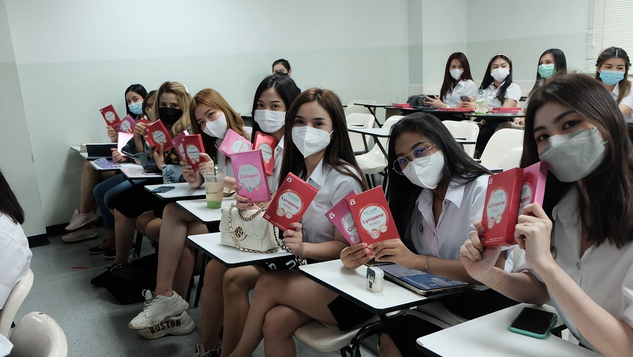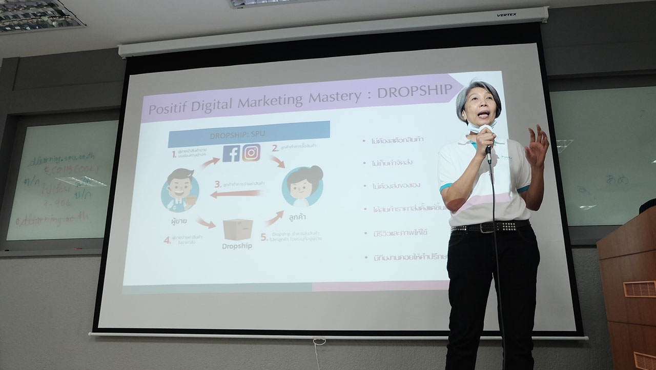 คุณโสภา เฟื่องปัญญา ผู้จัดการฝ่ายการตลาด บริษัท เคบีเอ็ม กู๊ดวิล จำกัด ผู้ผลิตและจัดจำหน่ายแบรนด์ “โพสิทีฟ” ได้ให้ความรู้ด้านการตลาด และการขาย ข้อมูลจุดขาย รวมถึงการแชร์ประสบการณ์ด้านการตลาดออนไลน์เพื่อให้นักษาศึกษาได้ลองนำไปประยุกต์ใช้ในการลงมือปฏิบัติจริง ในห้องเรียนและนอกจากนี้ยังให้โจทย์การทำการตลาดออนไลน์ ด้วยผลิตภัณฑ์จริงของ Positif (โพสิทีฟ) พร้อมเงินสนับสนุนในการทำการตลาด ซึ่งเปิดโอกาสให้นักศึกษาได้เรียนรู้ระบบ Dropship หรือ Drop Shipping ซึ่งเป็นรูปแบบการทำธุรกิจขายสินค้าออนไลน์ วิธีขายปลีกสินค้าแบบที่ผู้ขายไม่ต้องสต๊อกสินค้า หรือมีสินค้าที่จะขายเป็นของตัวเอง รวมถึงมีระบบสนับสนุนการขาย ตั้งแต่ต้นจนจบกระบวนการจัดส่งสินค้าไปยังผู้ซื้อ ซึ่งหลายคนรู้จักในรูปแบบของ “ตัวแทนจำหน่าย” ซึ่งเป็นรูปแบบธุรกิจออนไลน์ที่ดี สำหรับผู้เริ่มสนใจอยากทำธุรกิจของตัวเองเป็นครั้งแรก รวมไปถึงเรียนรู้ระบบการจัดส่งสินค้าอย่างครบวงจร โดยมีที่ปรึกษาด้านการตลาดตัวจริงคอยให้คำปรึกษา และให้ข้อมูลต่างๆ เกี่ยวกับสินค้า ตลอดระยะเวลาที่ทำโครงการ นอกจากความรู้เชิงทฤษฎีในห้องแล้ว ครั้งนี้เราจะมีการแข่งขันในทั้งด้านยอดขาย และการสร้างคอนเทนต์ ตามคอนเซปต์ “การเรียนกับตัวจริง ประสบการณ์จริง” เพื่อสร้างเรียนรู้ในการขายและการทำตลาดในสถานการณ์จริง เริ่มตั้งแต่การวางแผนการตลาด การสร้างสรรค์คอนเทนต์ การเลือกเครื่องมือทางการตลาดดิจิทัล เทคนิคการขาย จนถึงการประเมินผล” เหมือนกับสถานการณ์ของธุรกิจจริง ที่ต้องมีคู่แข่งขันอยู่เสมอ โดยแบ่งออกเป็น 5 รางวัล ได้แก่ 1. ทีมที่มียอดขายรวมทุกผลิตภัณฑ์สูงสุดจะได้รับเงินรางวัล 10,000 บาท 2. ทีมที่มียอดขายผลิตภัณฑ์เสริมอาหารสูงสุดจะได้รับเงินรางวัล 5,000 บาท 3. ทีมที่มียอดขายผลิตภัณฑ์สกินแคร์จะได้รับเงินรางวัล 5,000 บาท 4. ทีมที่ทำคลิปวิดีโอยอดเยี่ยมได้รับเงินรางวัล 5,000 บาท และ 5. ทีมที่ทำภาพนิ่งยอดเยี่ยม ได้รับเงินรางวัล 5,000 บาท