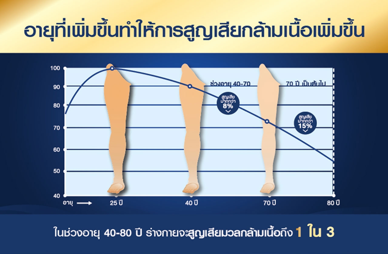 ปัจจุบันการใส่ใจตัวเองเพื่อให้ร่างกายแข็งแรงพร้อมจะสนุกกับการใช้ชีวิตไปนานๆ เป็นสิ่งที่หลายคนต่างให้ความสำคัญ เทรนด์การเลือกทานอาหารที่มีประโยชน์ และการออกกำลังกายจึงได้รับความสนใจมากขึ้น อย่างไรก็ตามหนึ่งในปัญหาที่เลี่ยงได้ยากแม้ว่าจะพยายามดูแลตัวเองมากแค่ไหนก็คือ “การสลายของมวลกล้ามเนื้อ” ที่มีการสลายตัวแปรผันไปตามอายุที่มากขึ้น โดยเมื่ออายุ 40-80 ปี มวลกล้ามเนื้ออาจสลายไปถึง 1 ใน 3 การสลายของมวลกล้ามเนื้อในวัยสูงอายุ เป็นหนึ่งในสาเหตุหลักของความเสี่ยงต่อการ “พลัดตกหกล้ม” ที่เพิ่มสูงขึ้นตามอายุ โดยในประเทศไทยมีรายงานผู้สูงอายุที่พลัดตกหกล้มมากถึง 27%-42% ต่อปีเลยทีเดียว¹