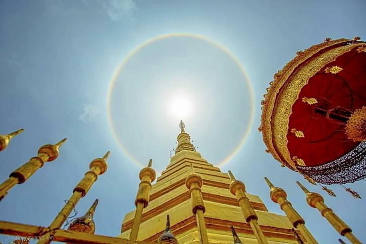 ...จะมีดวงแก้วสีเขียวบ้าง ขาวบ้าง เหลืองบ้าง แสดงปาฏิหาริย์เปล่งแสงเป็นดวงสีลอยล่องในอากาศ ผู้ที่พบเห็นจะยกมือไหว้และบอกให้ลูกหลานที่เห็นว่าเป็นของดีของวิเศษ หรือก็บอกว่า“พระธาตุออกแอ่วบ้าง พระธาตุเสด็จบ้าง”