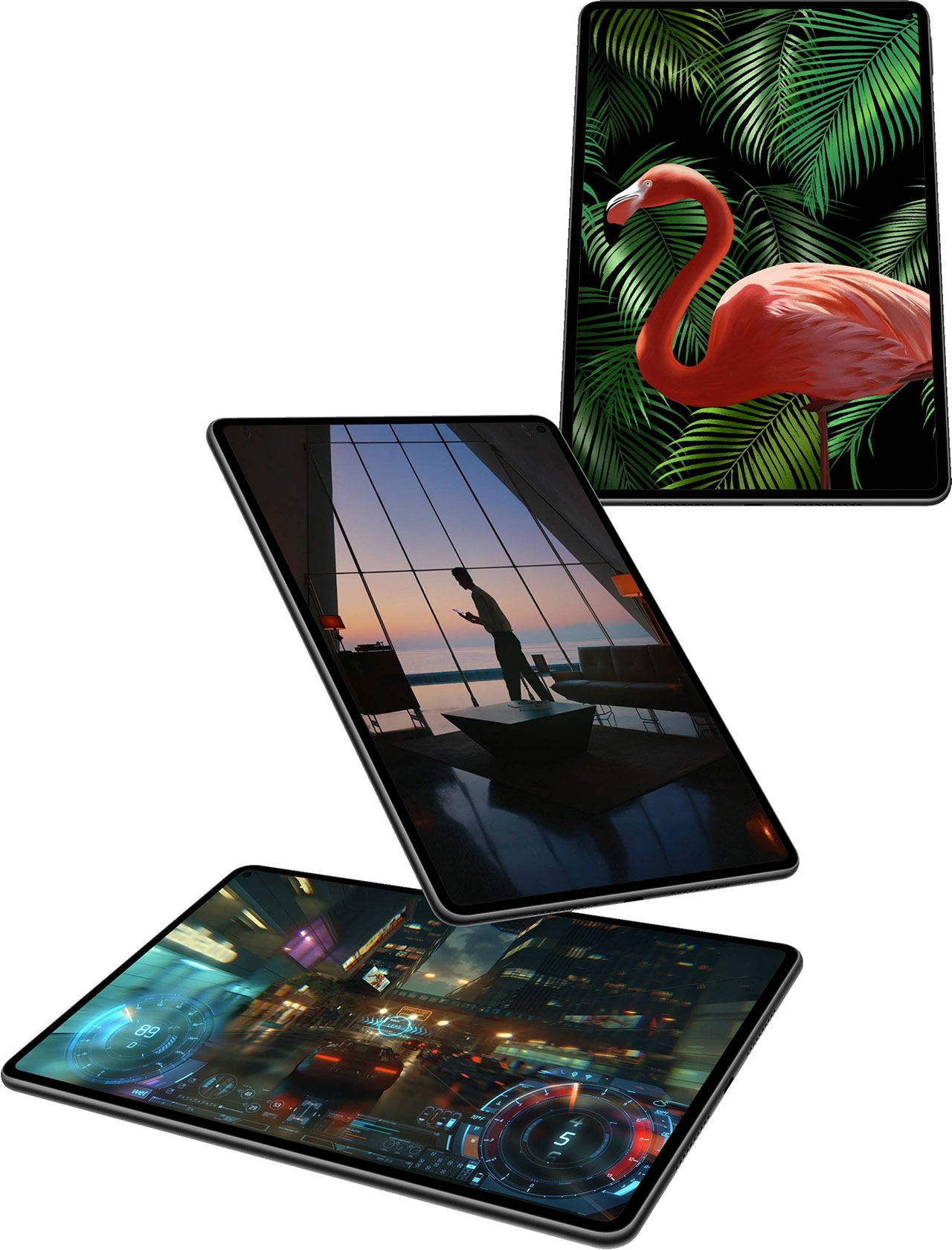 เปิดโลกใบใหม่ที่ใหญ่และสวยกว่าเดิมผ่านหน้าจอ HUAWEI FullView Display แบบ OLED ขนาด 11 นิ้ว ความละเอียด 2560 x 1600 พิกเซล แสดงสีบนหน้าจอได้ถึง 1.07 พันล้านสีและมีค่าความแม่นยำของสี △E <1 ถ่ายทอดรายละเอียดได้สมจริงในทุกมิติ แม้ในที่แสงน้อยและเต็มตาสุดๆ กับขอบจอบางเฉียบเพียง 4.2 มิลลิเมตร ให้อัตราส่วนหน้าจอต่อตัวเครื่องที่กว้างขึ้นถึง 92% พร้อมการแสดงผลอย่างลื่นไหลสูงสุดถึง 120 เฟรมต่อวินาที ช่วยให้การจดบันทึกและวาดเส้นด้วยปากกาเป็นไปอย่างสมูธ อ่าน E-Book หรือข้อความขณะท่องเว็บก็ราบรื่น ทั้งยังเป็นแท็บเล็ตของหัวเว่ยรุ่นแรกที่ได้รับการรับรอง Full Care Display 3.0 ซึ่งเป็นมาตรฐานการรับรองที่ครอบคลุมที่สุดของ TÜV Rheinland การันตีลดแสงสีฟ้าที่เป็นอันตรายต่อดวงตาในระดับฮาร์ดแวร์ สามารถปรับลดแสง PWM (Pulse Width Modulation) ได้ที่ความถี่สูง 1440 Hz เพื่อให้มองจอได้อย่างสบายตาในที่แสงน้อย เสริมเทคโนโลยีการแสดงผลที่ปรับสมดุลโทนสีให้เข้ากับแสงธรรมชาติทั้งโทนเย็นและโทนอุ่น ยกระดับประสิทธิภาพการมองเห็นในสภาพแวดล้อมแสงที่แตกต่างกันได้