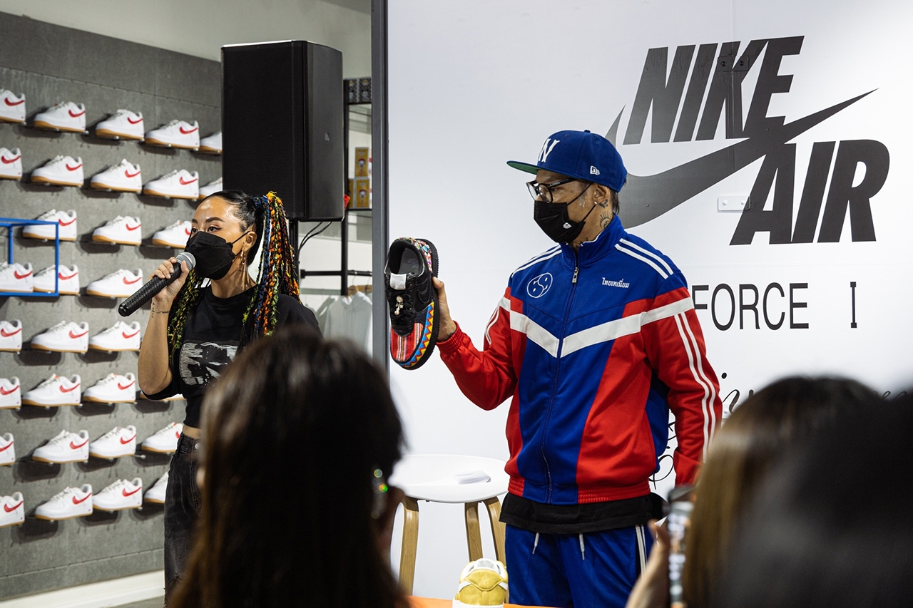 แรงบันดาลใจจากกลุ่มชาติพันธุ์ล่าหู่แดงทางภาคเหนือที่ถ่ายทอดออกมาผ่านงานหัตถกรรมที่สืบทอดมาตั้งแต่สมัยโบราณ โดยวัสดุที่ใช้ในการออกแบบ Air Force 1 คู่นี้จะเป็น ‘ผ้าทอล่าหู่แดง’ จากชุมชนบ้านห้วยป่าแขม จังหวัดเชียงใหม่ ซึ่งมีความพิเศษอยู่ที่วิธีการทอเฉพาะ โดดเด่นด้วยสีสันที่สดใส บนลายผ้าจะมีสัญลักษณ์สามเหลี่ยมแสดงถึงภูเขาอันสื่อถึงวิถีชีวิตของชาวล่าหู่ที่ชอบอยู่บนป่าเขา สีสันสดใสบนผ้าเปรียบเหมือนดอกไม้ป่าที่สดใสสวยงามและมีหลากหลายและสัญลักษณ์ประจำตัวของล่าหู่คือน้ำเต้าเพราะเชื่อว่าน้ำเต้าแสดงถึงความอุดมสมบูรณ์ โดยการออกแบบของคู่นี้จะใช้ลวดลายต่างๆ ของผ้าทอล่าหู่แดงมาจับคู่เข้ากับตัวรองเท้าสีดำ ซึ่งจัดวางออกมาได้อย่างลงตัว และสามารถชูความเป็นเอกลักษณ์ของลวดลายออกมาได้อย่างชัดเจน