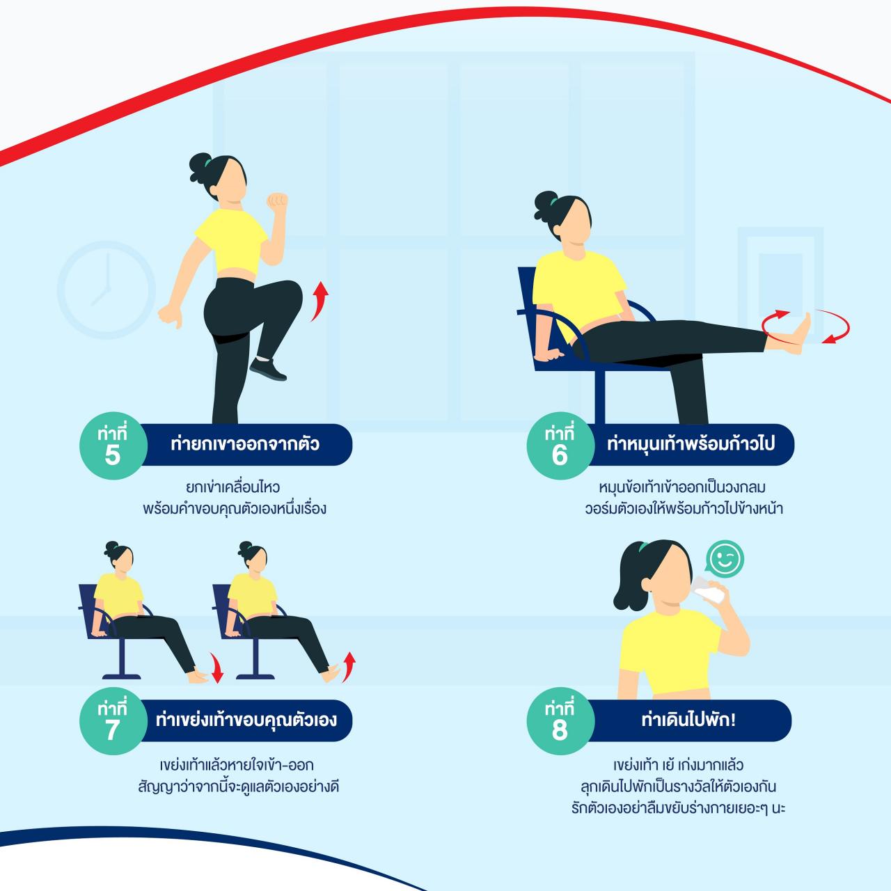 - ท่าที่ 6 “หมุนข้อเท้า วอร์มตัวเองให้พร้อมก้าวไปข้างหน้า” ให้ยืนตรงในท่าสบายๆ แล้วยกขาข้างใดข้างหนึ่งให้นิ้วเท้าแตะที่พื้น แล้วหมุนทวนเข็มนาฬิกา 8 ครั้ง หมุนตามเข็มนาฬิกาอีก 8 ครั้ง จากนั้นสลับทำแบบเดียวกันกับขาอีกข้าง ทำแบบนี้ซ้ำจำนวน 3 ยก หากไม่สามารถยืนได้ให้นั่งบนเก้าอี้แล้วทำลักษณะเดียวกัน
