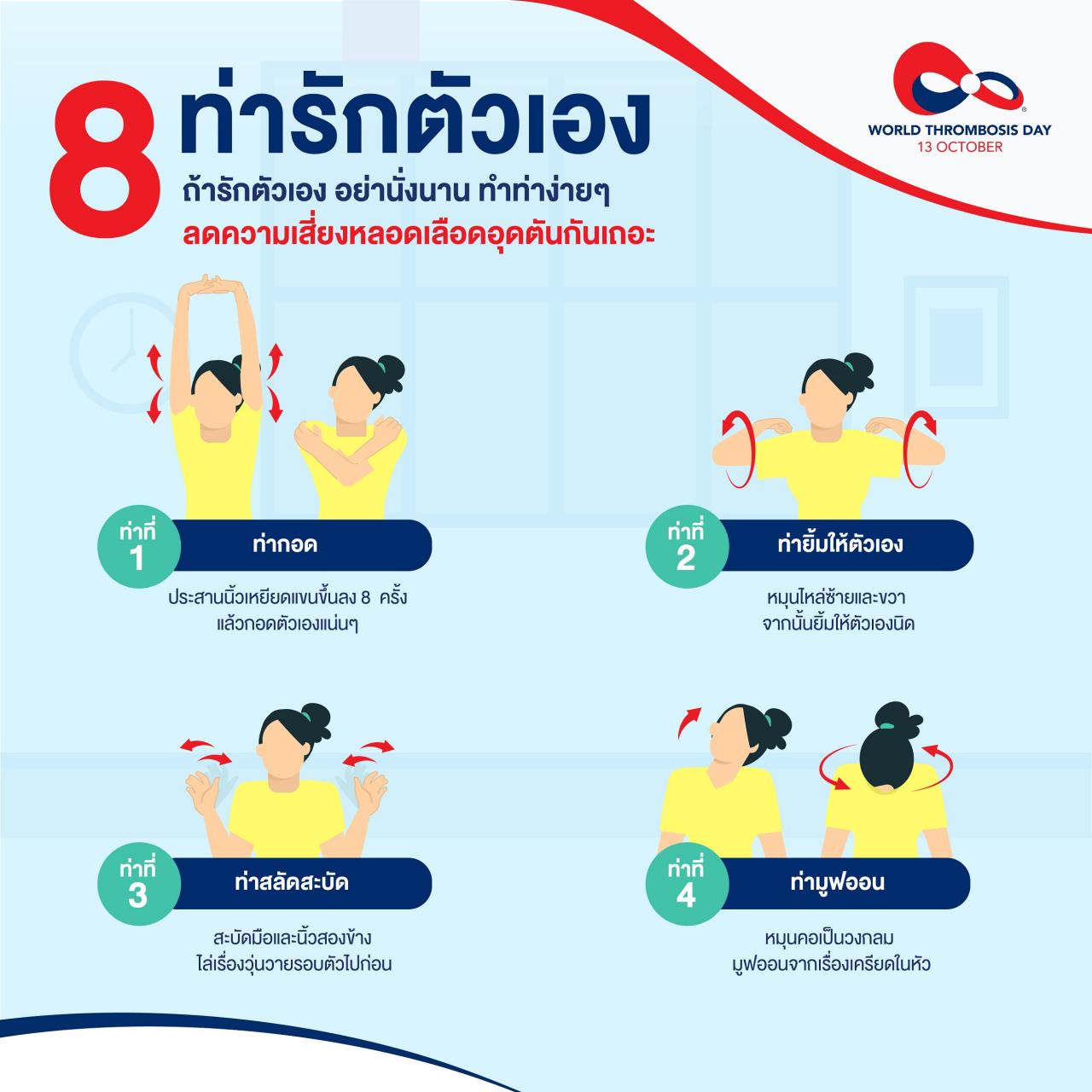 13 ตุลาคมของทุกปี เป็น "วันหลอดเลือดอุดตันโลก (World Thrombosis Day)" ที่มีความสำคัญเพราะเป็นโรคที่เป็นภัยเงียบร้ายกาจ อาจทำให้เสียชีวิต แต่ก็ป้องกันได้ โดยเบื้องต้นมีคำแนะนำการขยับร่างกาย 8 ท่าที่ใช้เวลาเพียง 8 นาที ที่ช่วยลดความเสี่ยงการเกิดโรคหลอดเลือดอุดตันได้